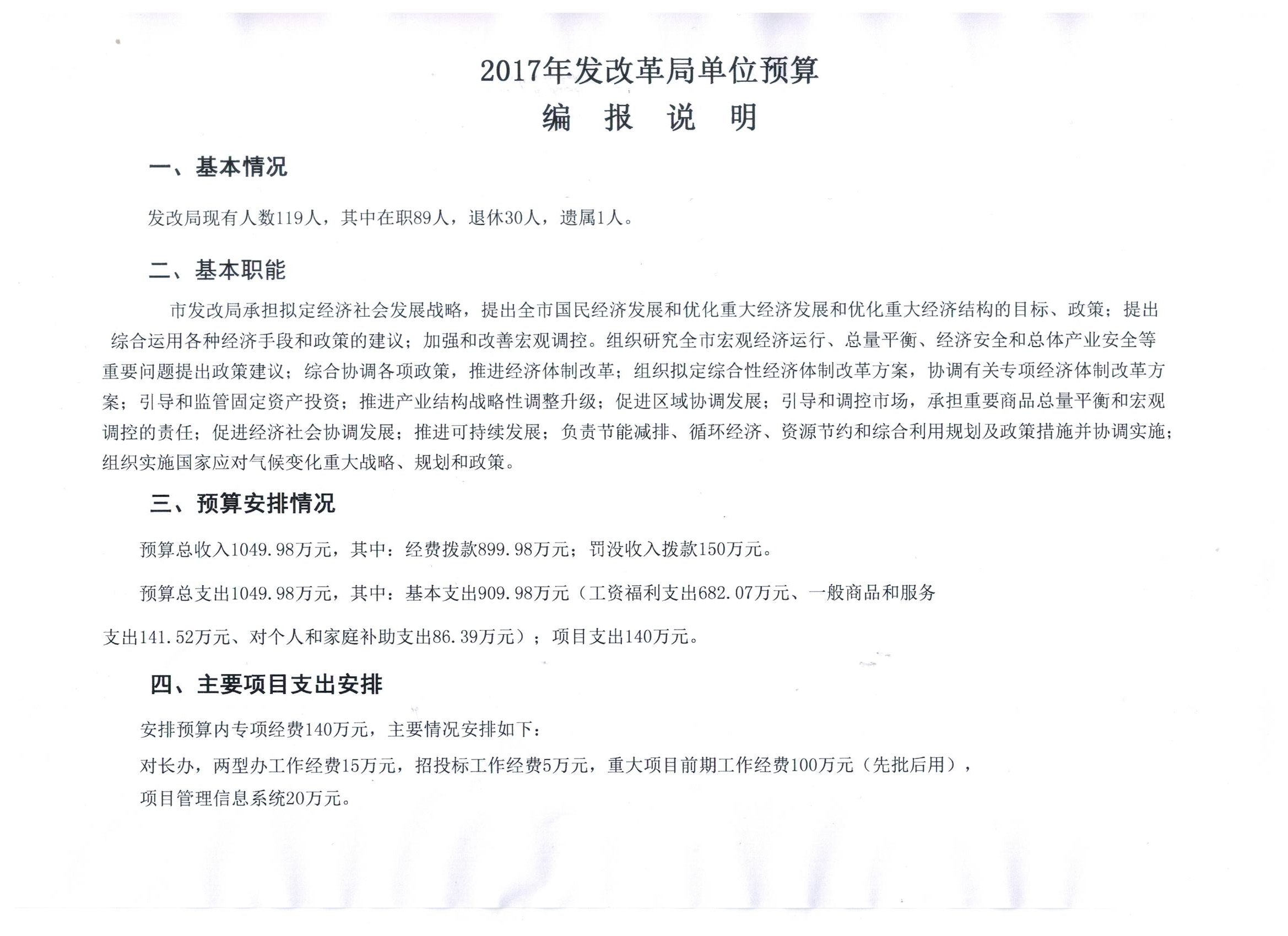 1、年度收支预算情况。我部门2017年度预算总收入 1049.98万元,比2016年增加68.54万元;(2016年发改局预算392.08万元,2016年物价局预算589.36万元合计981.44万元。)本年预算总支出 1049.98万元,比2016年增加68.54万元。