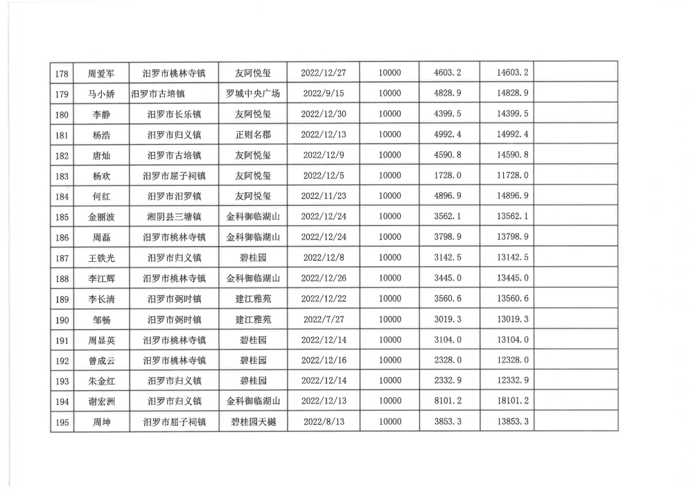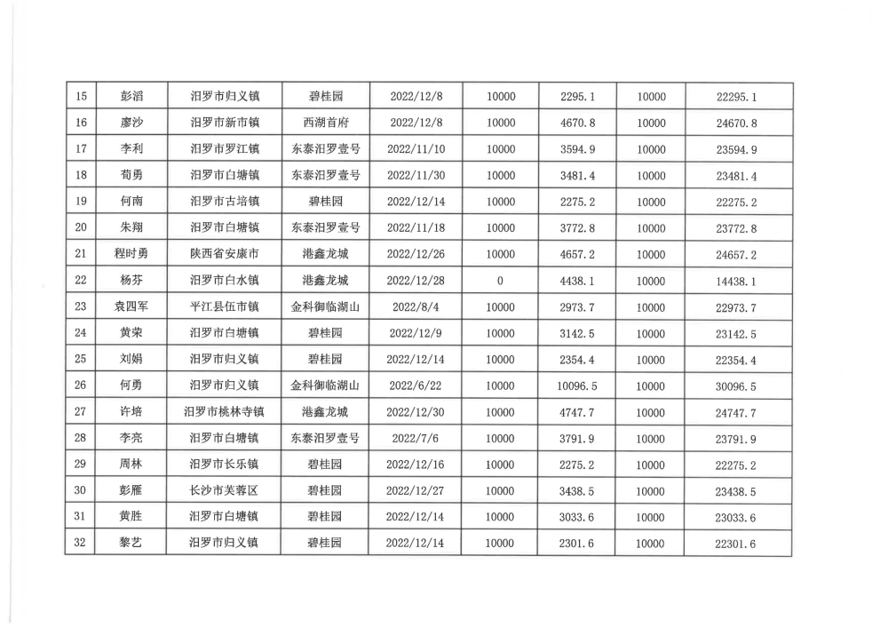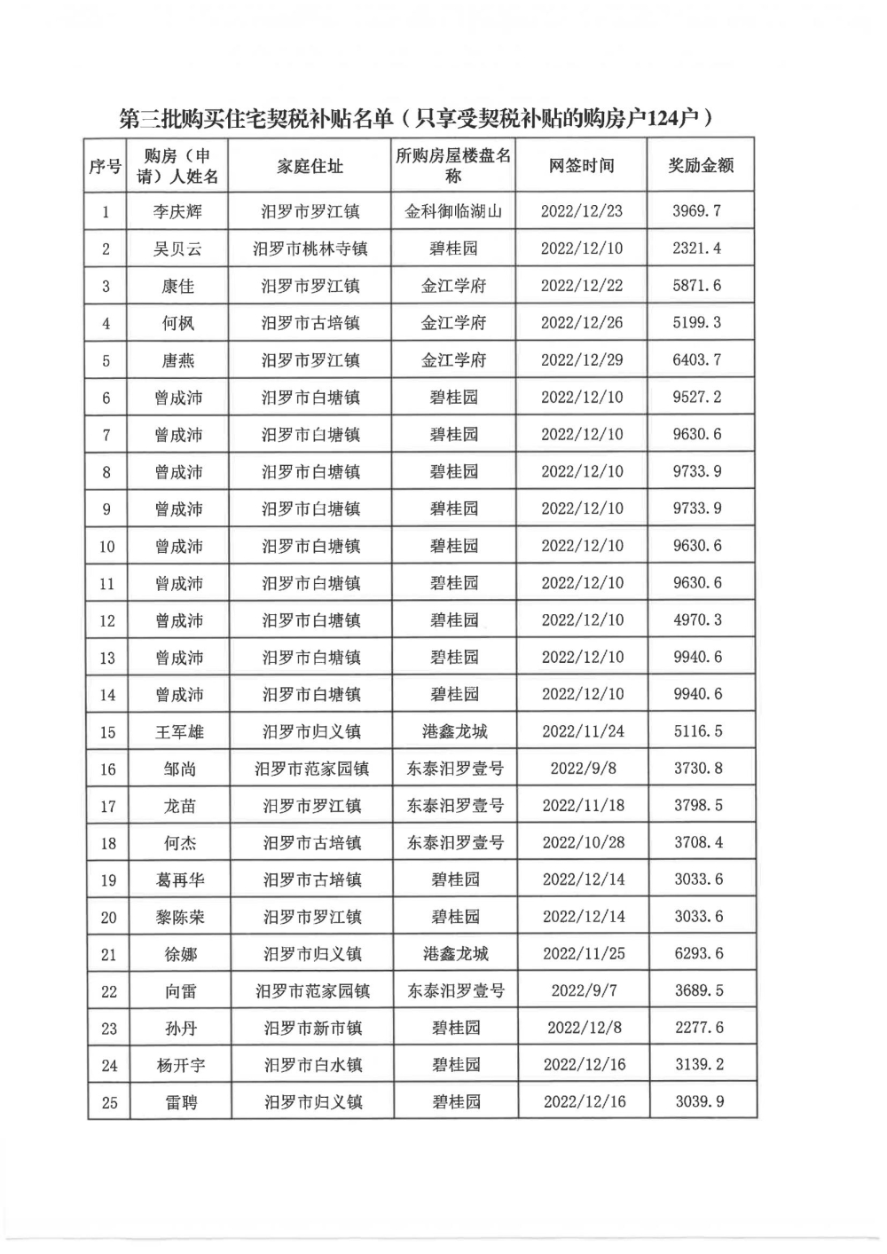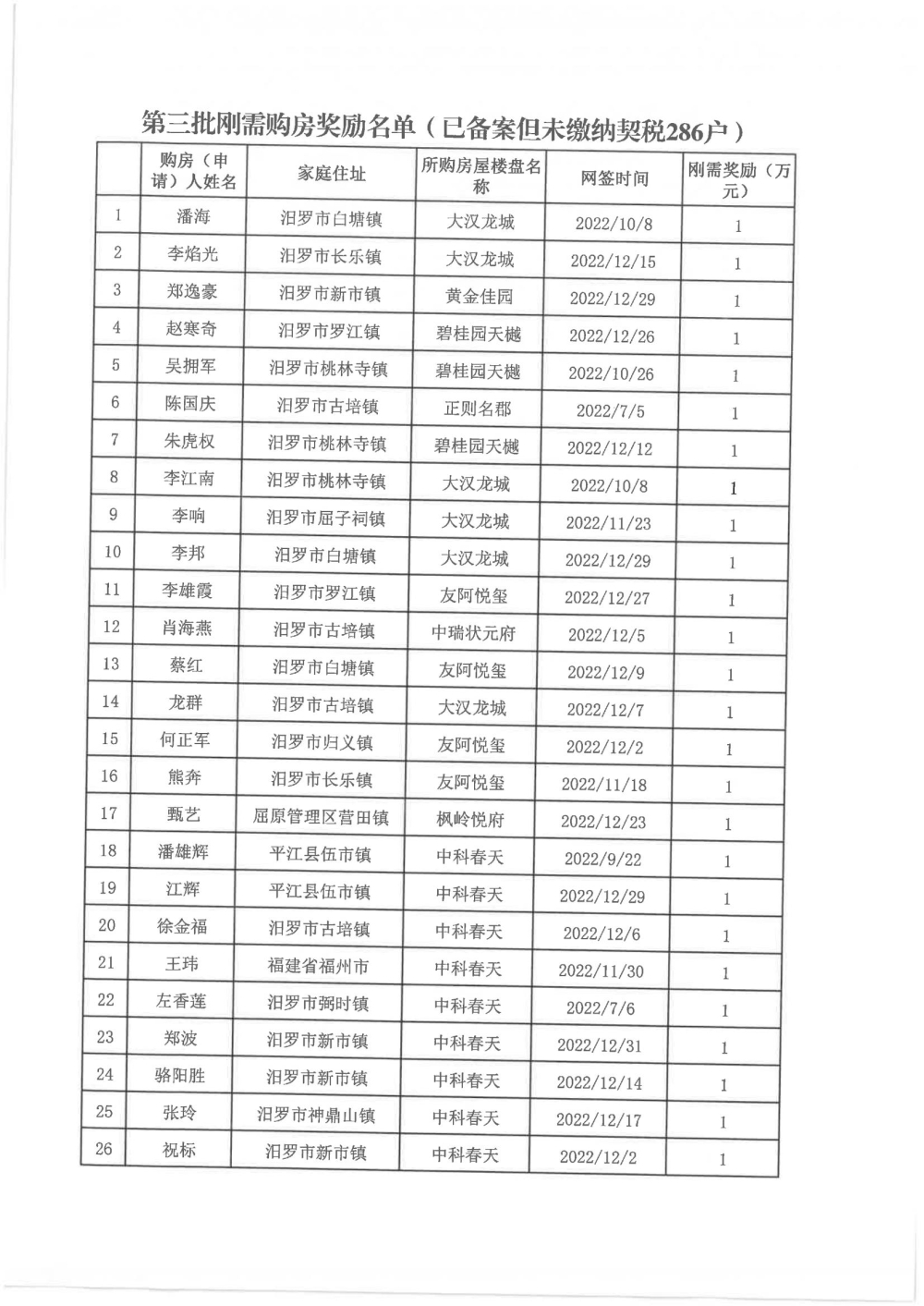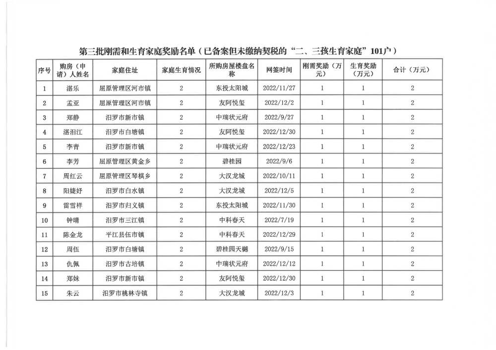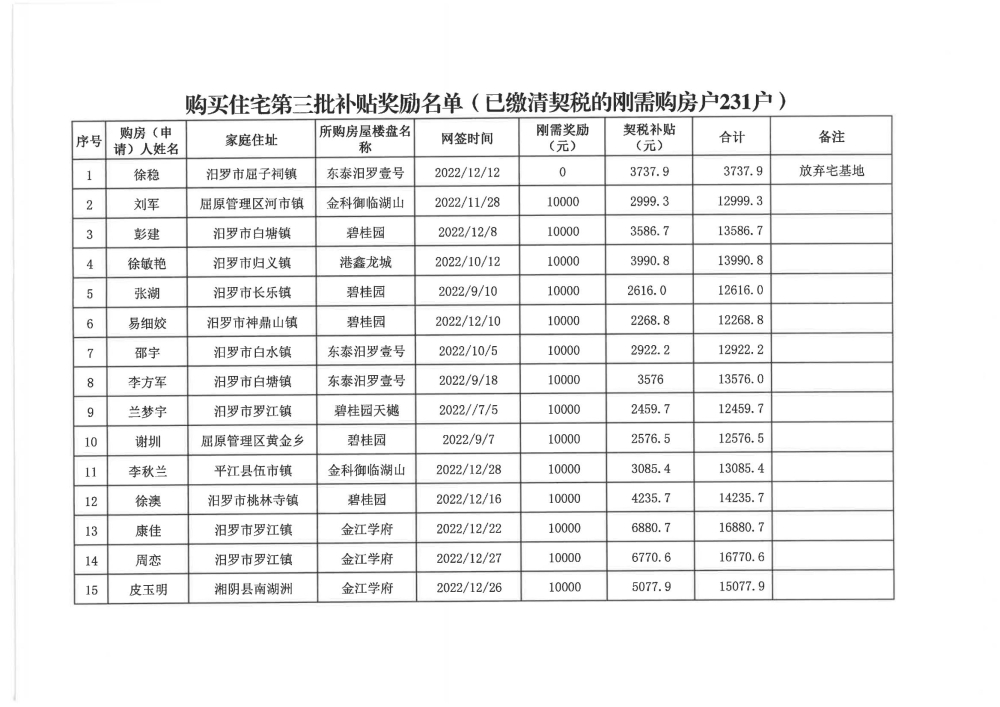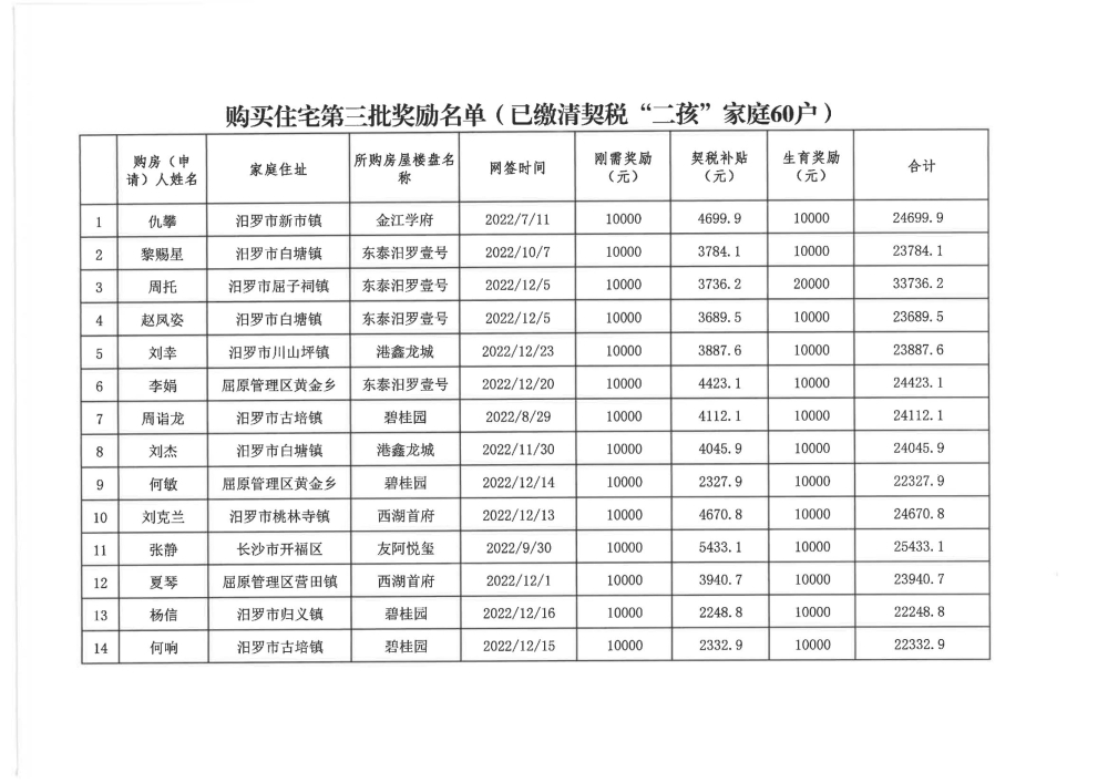 根据汨政办发(2022)13号《关于进一步促进汨罗市房地产市场平稳健康发展的若干措施(试行)》的规定,经汨罗市房地产协调机制办公室审核,现对我市2022年6月21日-12月31日期间购买商品房第三批共850户申报财政购房奖励和契税补贴名单信息予以公示。公示期为五个工作日(2023年10月20日-10月26日)。购房奖励和契税补贴发放流程:公示无异议后,市财政部门受理申请、组织银行发放。具体发放时间另行通知。