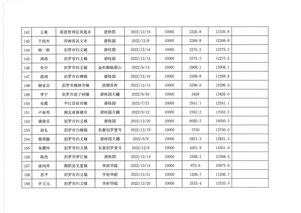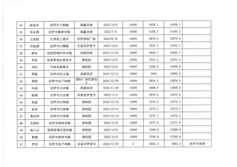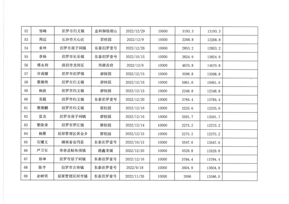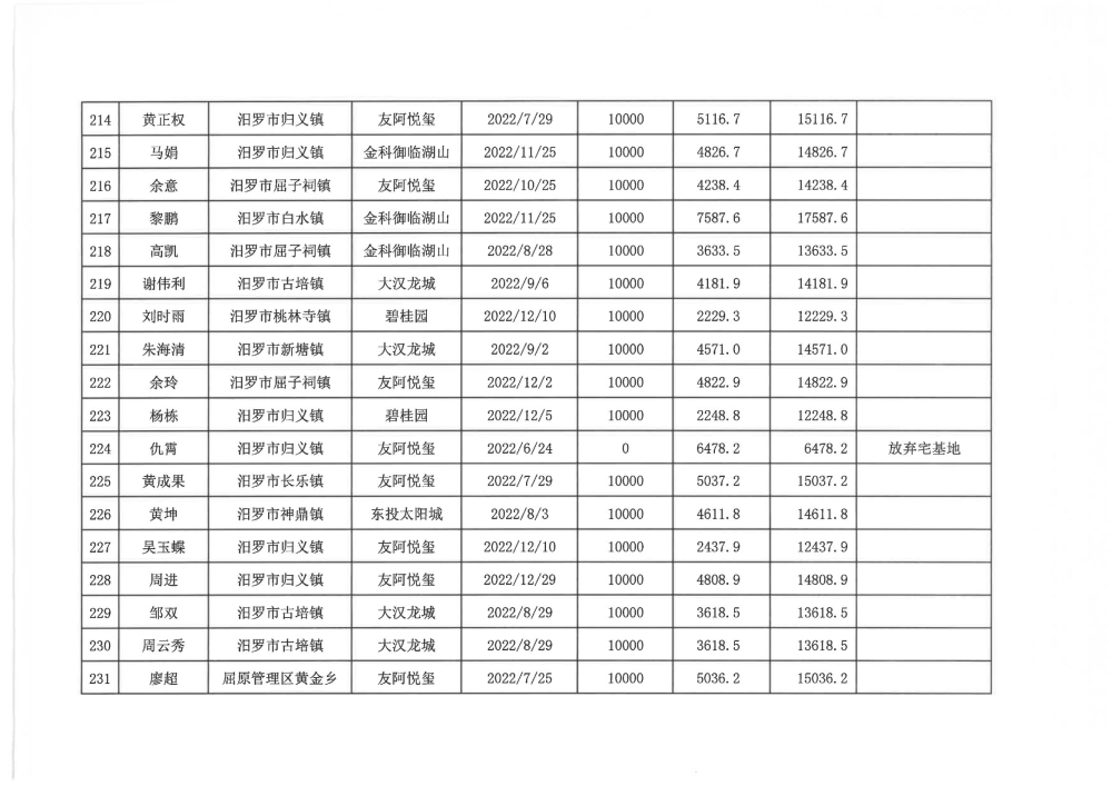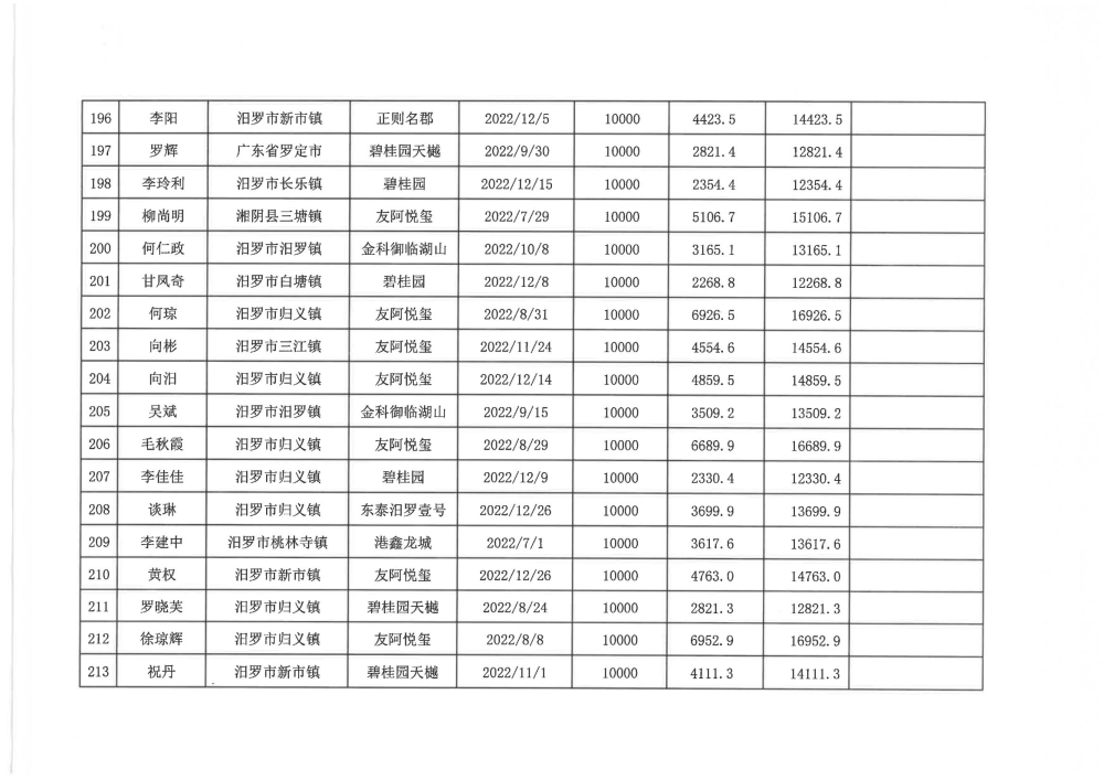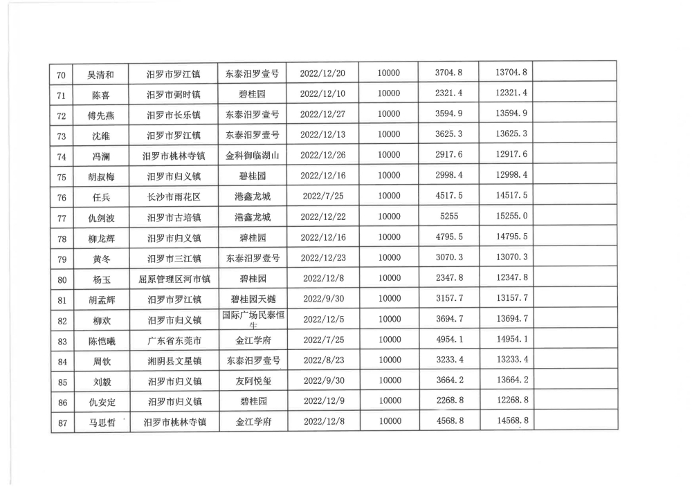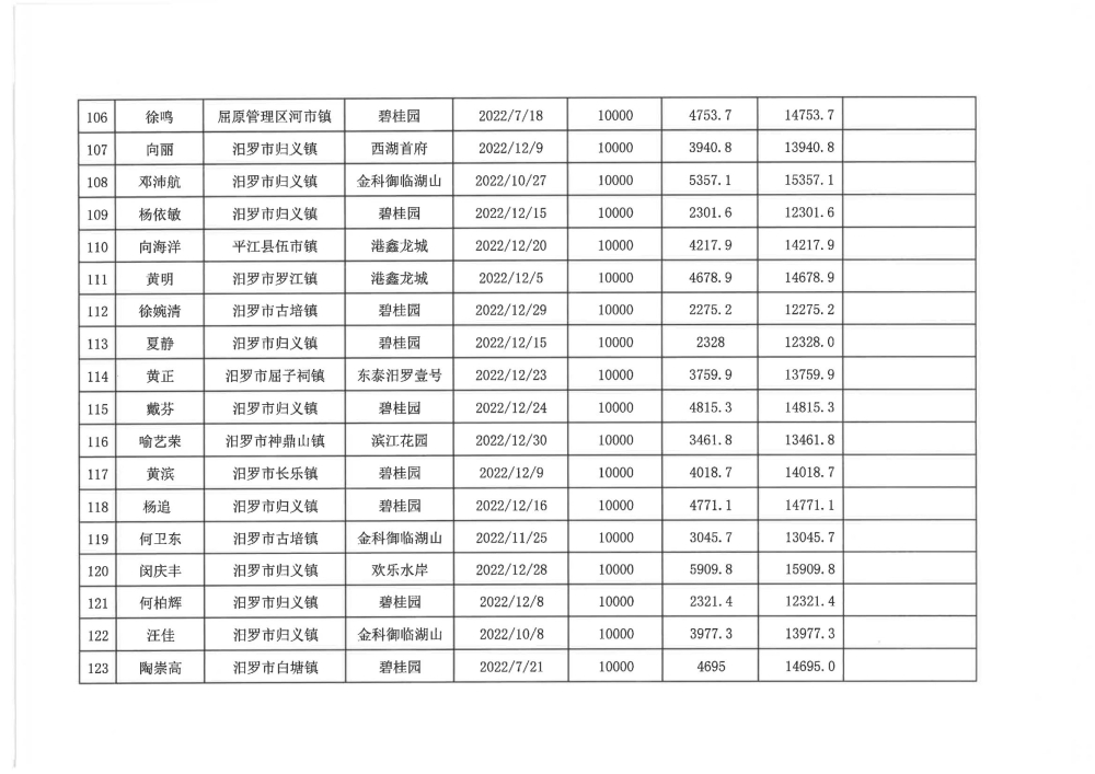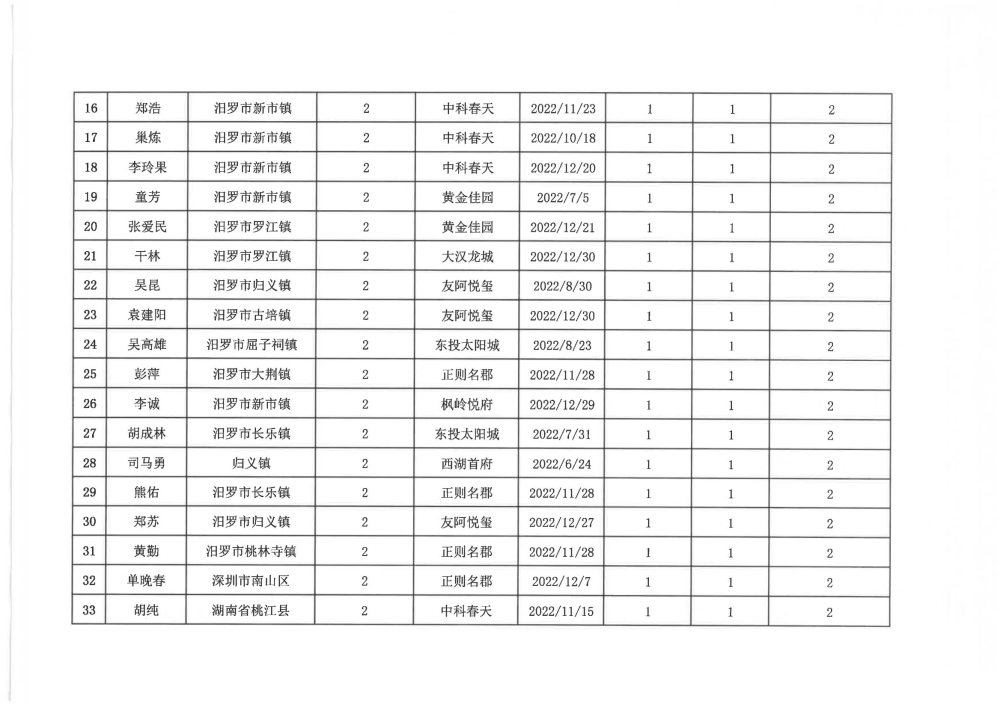 根据汨政办发(2022)13号《关于进一步促进汨罗市房地产市场平稳健康发展的若干措施(试行)》的规定,经汨罗市房地产协调机制办公室审核,现对我市2022年6月21日-12月31日期间购买商品房第三批共850户申报财政购房奖励和契税补贴名单信息予以公示。公示期为五个工作日(2023年10月20日-10月26日)。购房奖励和契税补贴发放流程:公示无异议后,市财政部门受理申请、组织银行发放。具体发放时间另行通知。