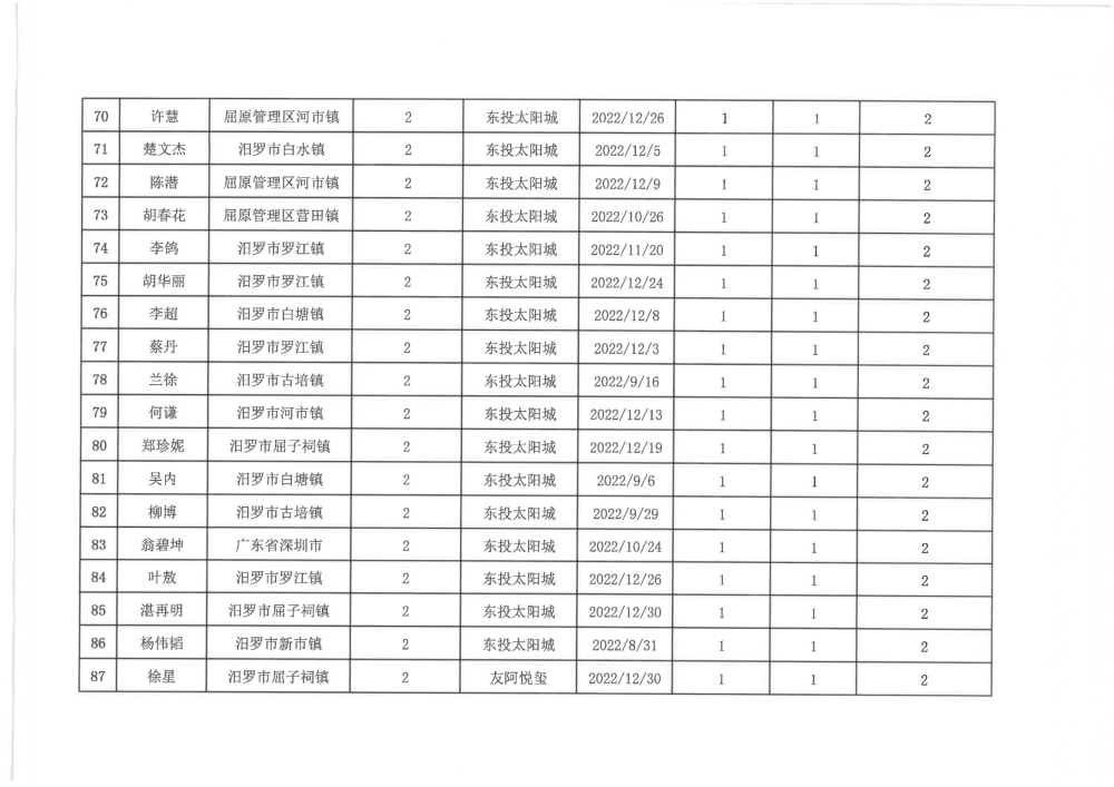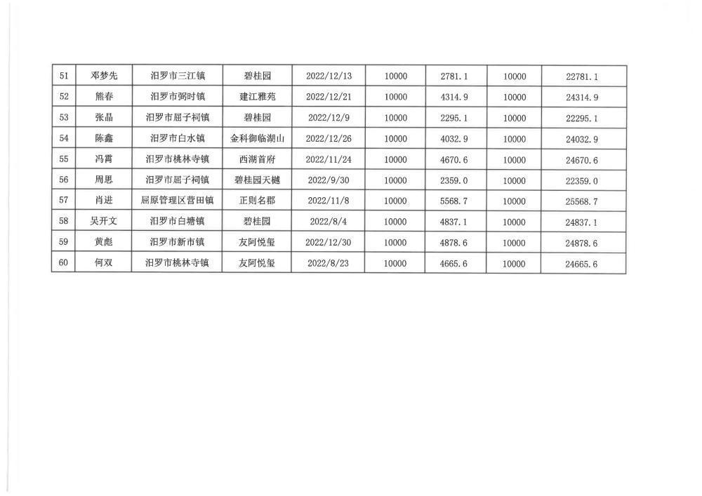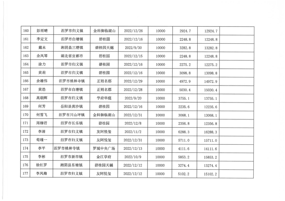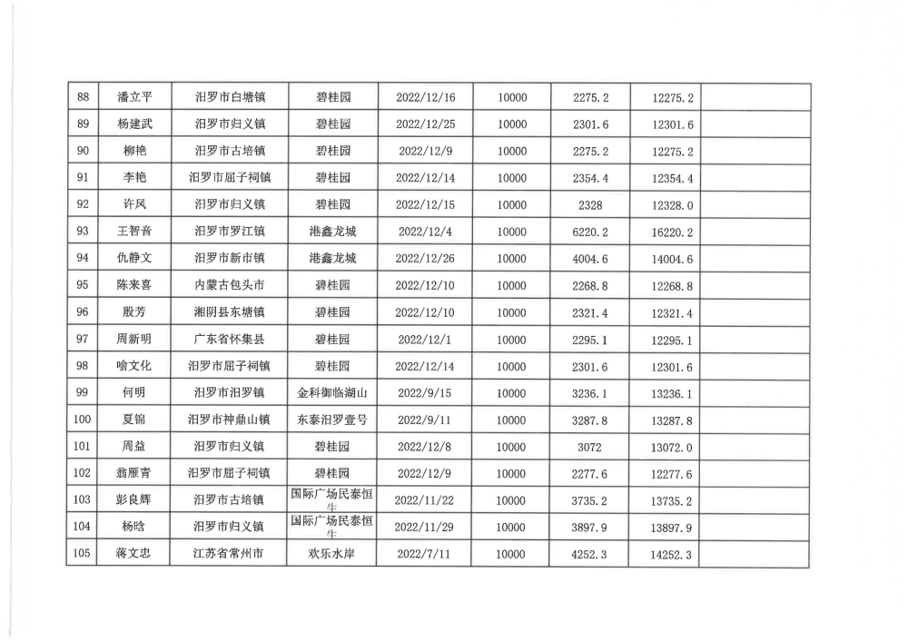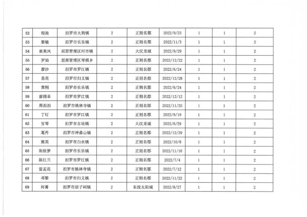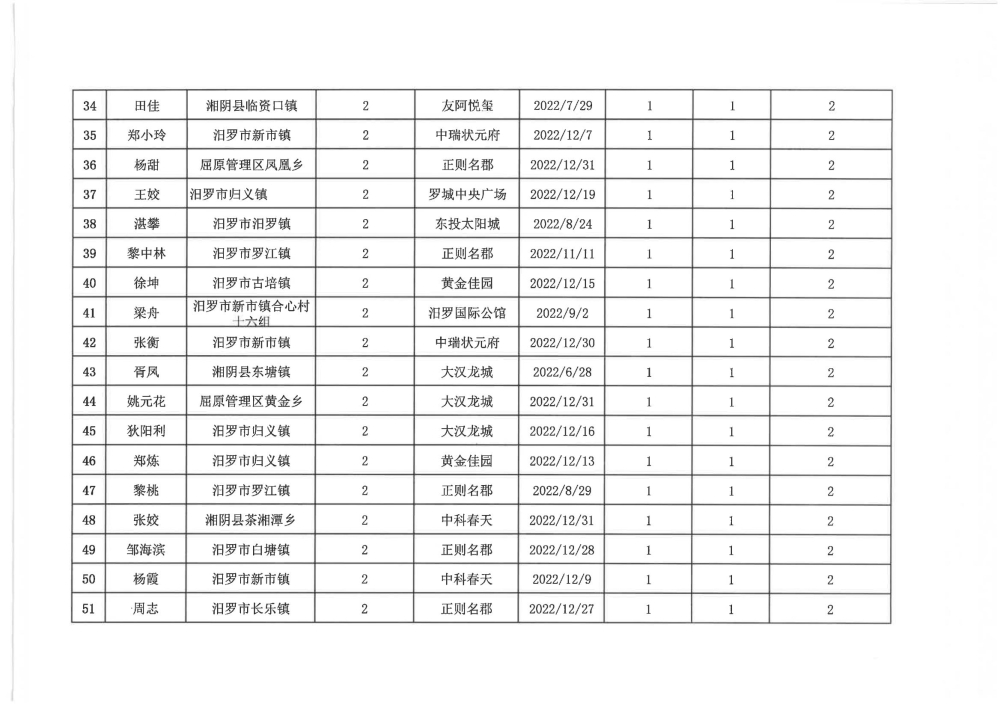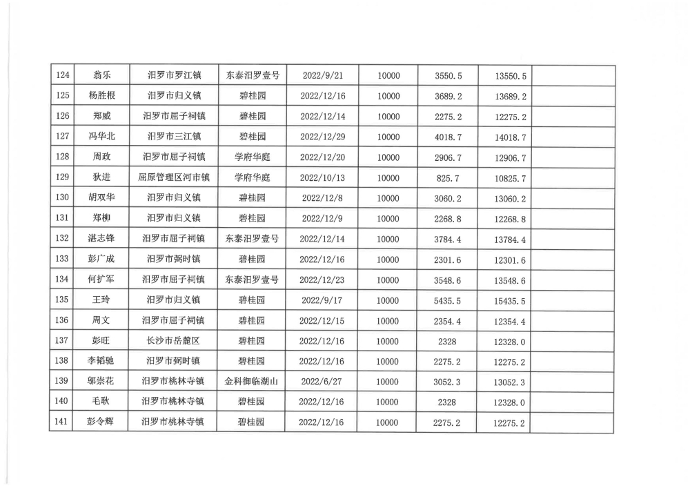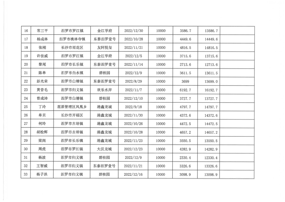 根据汨政办发(2022)13号《关于进一步促进汨罗市房地产市场平稳健康发展的若干措施(试行)》的规定,经汨罗市房地产协调机制办公室审核,现对我市2022年6月21日-12月31日期间购买商品房第三批共850户申报财政购房奖励和契税补贴名单信息予以公示。公示期为五个工作日(2023年10月20日-10月26日)。购房奖励和契税补贴发放流程:公示无异议后,市财政部门受理申请、组织银行发放。具体发放时间另行通知。