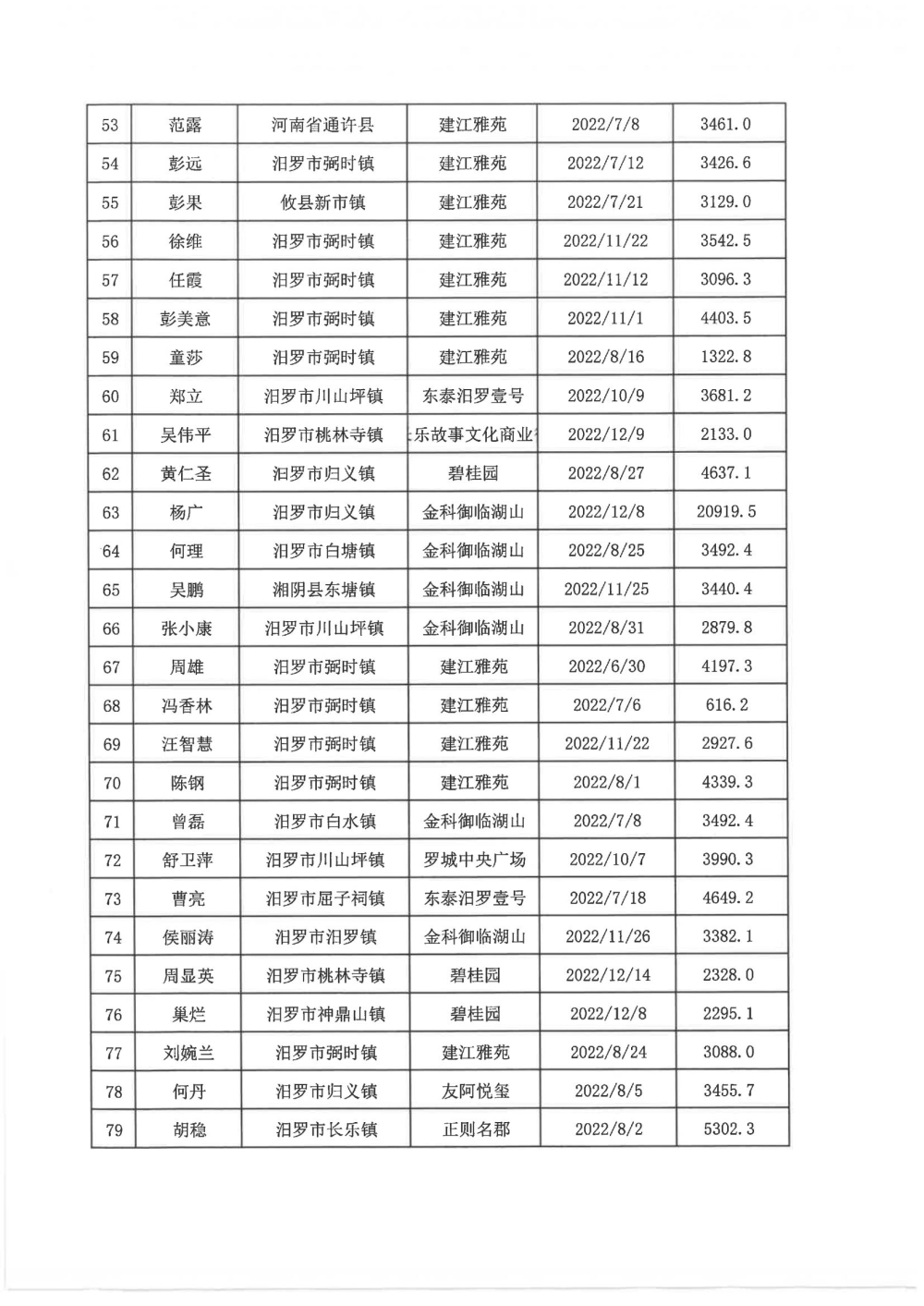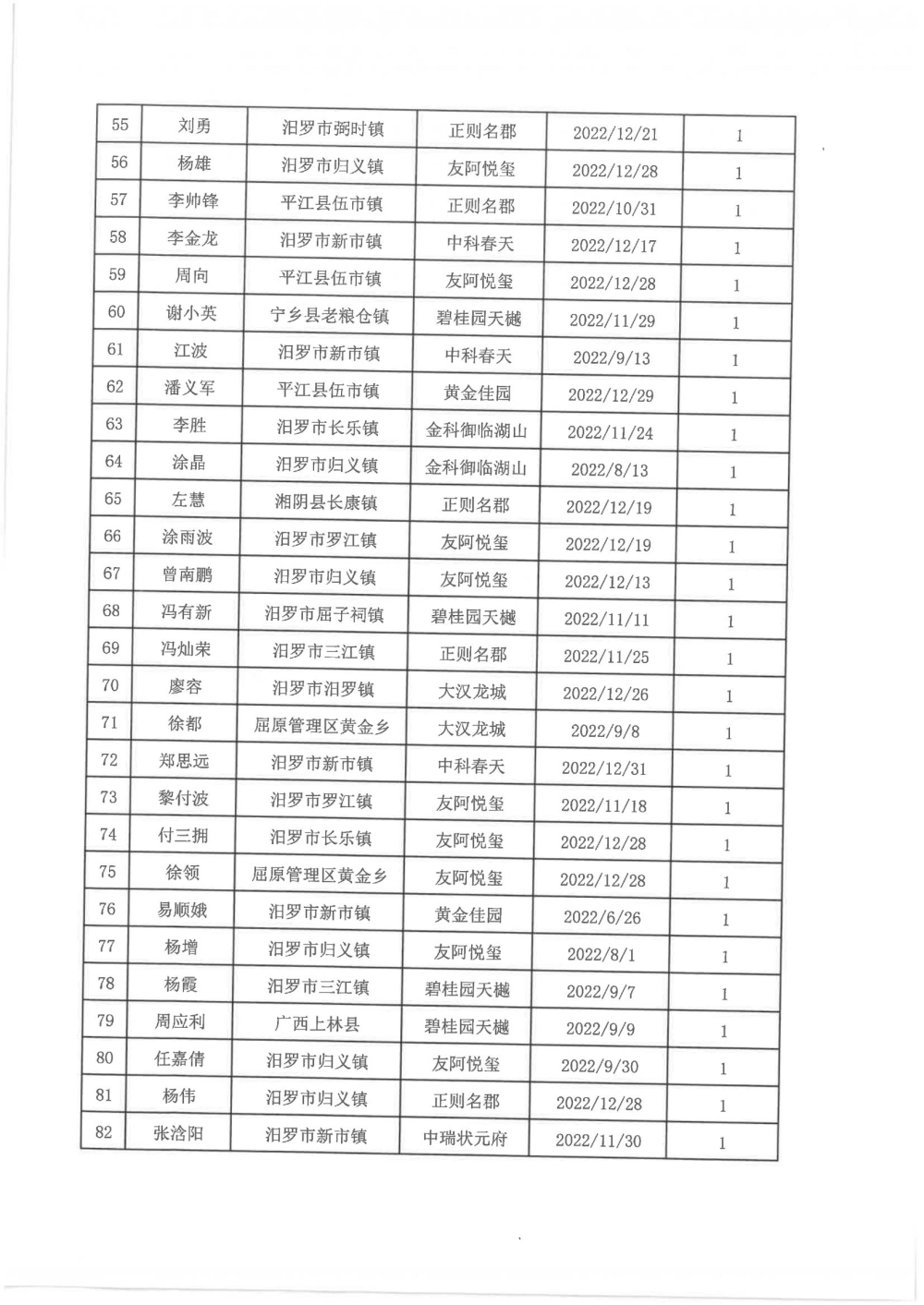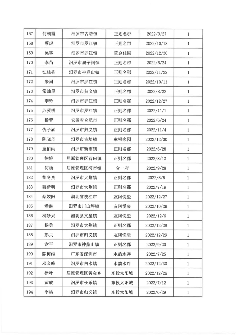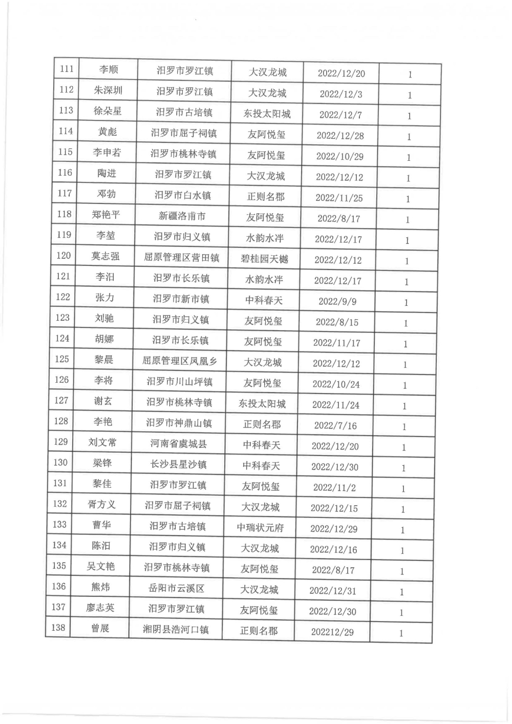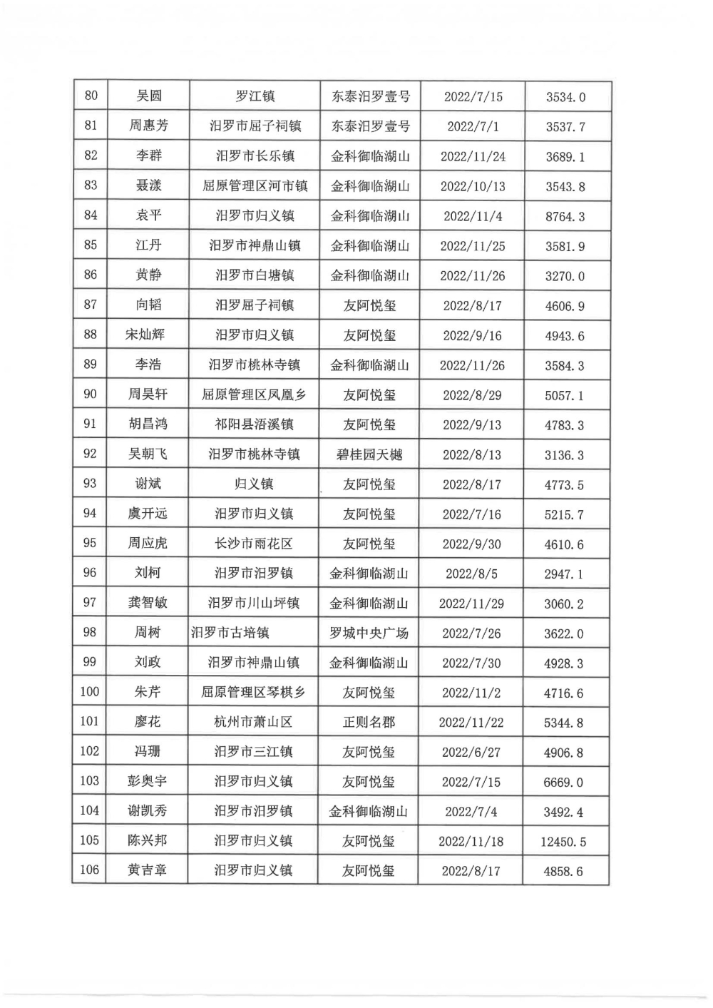 根据汨政办发(2022)13号《关于进一步促进汨罗市房地产市场平稳健康发展的若干措施(试行)》的规定,经汨罗市房地产协调机制办公室审核,现对我市2022年6月21日-12月31日期间购买商品房第三批共850户申报财政购房奖励和契税补贴名单信息予以公示。公示期为五个工作日(2023年10月20日-10月26日)。购房奖励和契税补贴发放流程:公示无异议后,市财政部门受理申请、组织银行发放。具体发放时间另行通知。