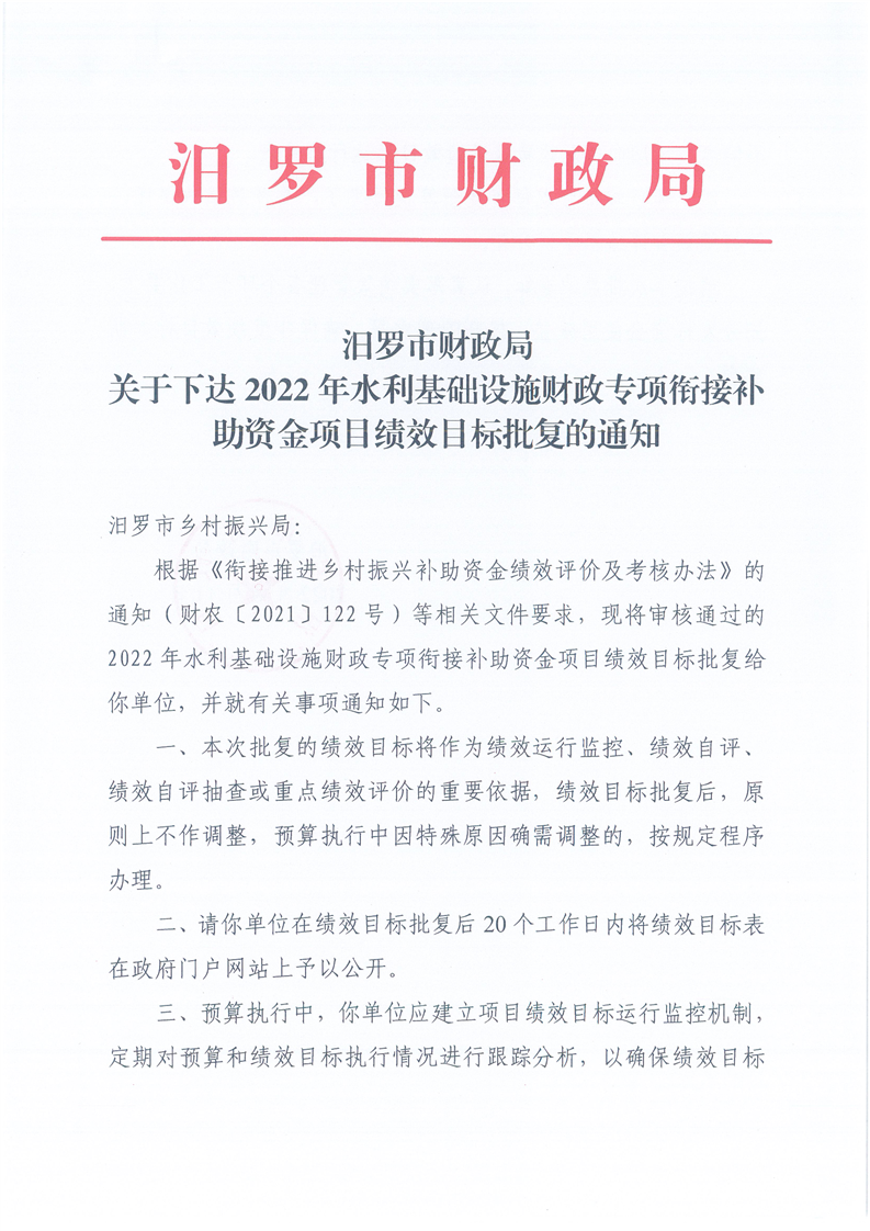 由我单位负责组织实施的2022年水利基础设施财政专项衔接补助资金项目绩效目标已经市财政部门批复《汨罗市财政局关于下达2022年水利基础设施财政专项衔接补助资金财政专项衔接补助资金项目绩效目标批复的通知》,根据绩效管理工作要求,现将批复后的绩效目标予以公开。