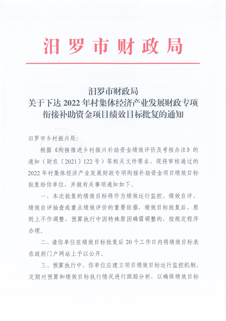 由我单位负责组织实施的2022年村集体经济产业发展财政专项衔接补助资金项目绩效目标已经市财政部门批复《汨罗市财政局关于下达2022年村集体经济产业发展项目绩效目标批复的通知》,根据绩效管理工作要求,现将批复后的绩效目标予以公开。