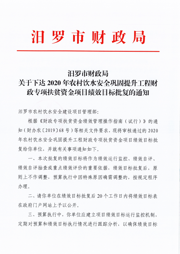 由我单位负责组织实施的2020年农村饮水安全提升巩固工程财政专项扶贫资金项目绩效目标已经市财政部门批复《汨罗市财政局关于下达2020年农村饮水安全提升巩固工程财政专项扶贫资金财政衔接推进乡村振兴补助资金绩效目标批复的通知》,根据绩效管理工作要求,现将批复后的绩效目标予以公开。