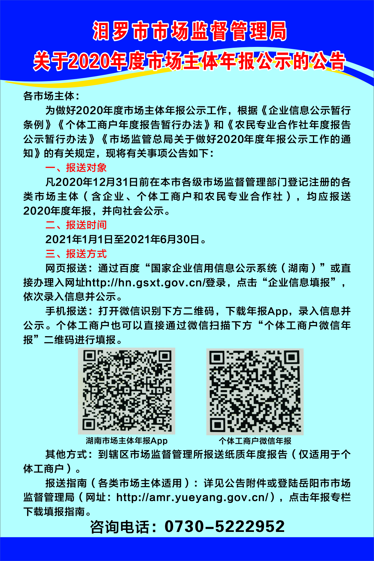 为做好2020年度市场主体年报公示工作,根据《企业信息公示暂行条例》《个体工商户年度报告暂行办法》和《农民专业合作社年度报告公示暂行办法》《市场监管总局关于做好2020年度年报公示工作的通知》的有关规定,现将有关事项公告如下: