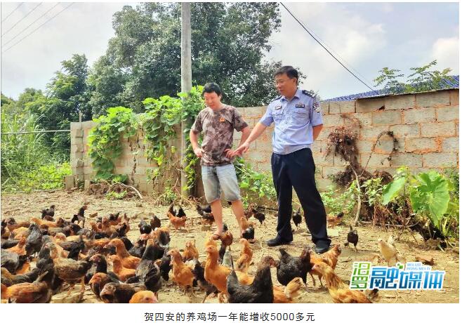 贫困户贺四安过去只有母亲相依为命,但现在他还有了一个养鸡场和200多只等着他照料的鸡仔。这个不大但热闹的养鸡场,由交警大队大队长李波实地查看三次、于去年开始选址帮建,到今年,算下来一年能为贺四安增收5000多元。