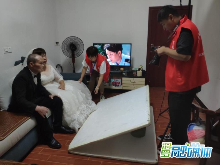吴嗲因生病多年行动不便,高塘社区志愿者与蓝天摄影工作人员特意为他们提供了入户拍摄服务。画好妆,换上婚纱、西装,在摄影师的指导下,吴嗲、兰娭毑老俩口开开心心完成了拍摄过程。