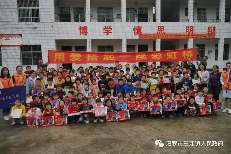 讲话结束,由我们社工和义工为学生发放爱心物资——阳光社工组织带来的相册和爱心人士带来了陀螺和遥控汽车。