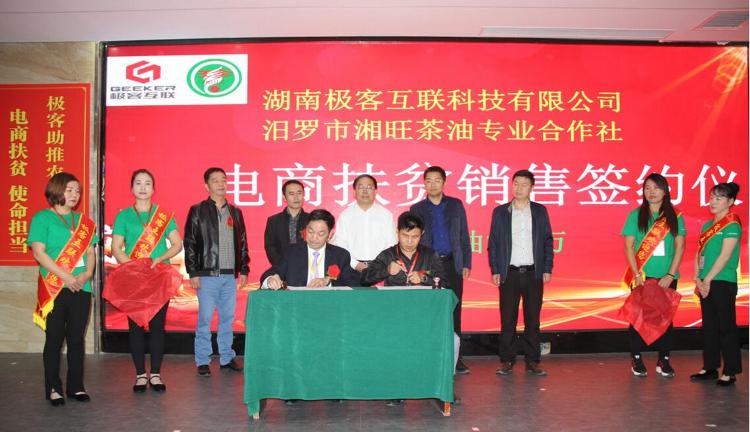 10月13日,湖南极客互联科技有限公司与汨罗市湘旺茶油专业合作社举办签约仪式,今年内该公司利用电商平台,帮助合作社销售200万元的油茶产品。市政协副主席、工商联主席周育林参加签约仪式。
