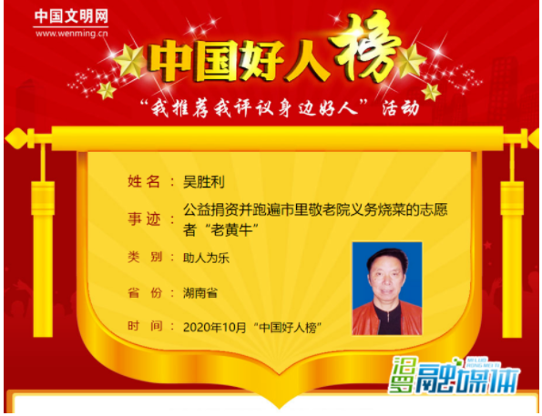 汨罗融媒体讯(记者 夏凡)12月4日,记者从中国文明网获悉,汨罗已故志愿者吴胜利当选助人为乐"中国好人",入选2020年10月"中国好人榜",成为汨罗第5位当选的"中国好人"。