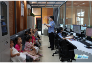 7月19日,在汨罗市公安局“警娃”暑托班上,民警正带着16名小朋友参观110接警大厅,近距离了解警察爸爸妈妈们的工作内容。据悉,这是市公安局推出的从优待警措施之一——开办“警娃暑托班,帮助解决民警、辅警子女暑假无人照看难题。