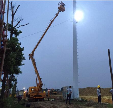 按照高泉新城指挥部要求,1天内架设好照明灯,保障项目工程进度。9月1日上午8时,灯管所工作人员召开紧急会议,决定分2组行动,一组赴长沙采购灯具,另一组赶往项目部做好测量准装灯杆子的杆径等前期准备工作。当天16时许,2组人员碰面,9名技术人员到位,2台登高车开始作业,经过近3小时,6盏大功率LED夜间照明灯架设完成。
