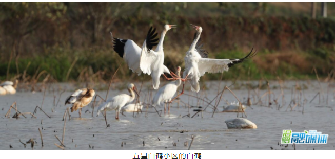 五星白鹤小区与鄱阳湖仅一堤之隔,是当地志愿者周海燕等人为解决白鹤食物短缺问题建立的"人工食塘"。今年,鄱阳湖水位居高不下,来此地越冬的2000多只白鹤先后被小区扩种的1045亩田藕吸引,纷纷来此觅食。周海燕称:"按相关数据,全球目前约有5000只白鹤,近一半到了鄱阳湖。"