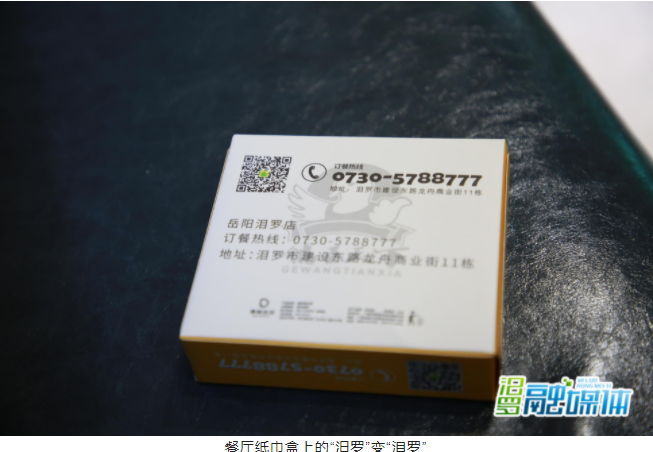 12月1日,市民鲁女士在建设东路“鸽王天下”餐厅吃饭。抽取纸巾时,她意外发现纸巾盒上标注的餐厅名称、地址中“汨罗”字样都印刷成了“泪罗”。这让深爱自己家乡的鲁女士感觉不适。