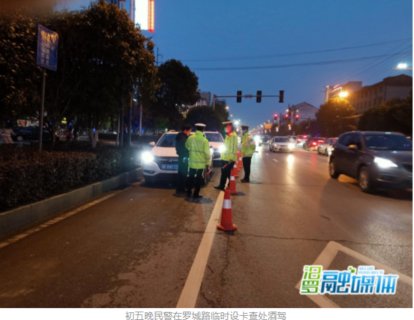 初六中午,范家园中队联合新市中队针对群众走亲访友,聚会增多情况,由各中队长及教导员带队,在汨罗江大道百丈涵洞路口设置临时检查点,开展酒驾集中整治行动。