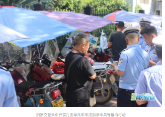 当天下午,汨罗市交警大队城区中队40多位民警、协警,顶着烈日冒着酷暑,“兵”分四路,在中心城区对摩托车交通违法行为进行“无缝隙式”突击查处,短短20分钟,共查处16台非法加装伞具、涉牌涉证的摩托车。针对驾驶人的违法行为,民警采取查处与教育相结合的方式,向驾驶人讲解非法加装伞具等道路交通违法行为的危害性,并对非法加装的伞具进行收缴,对违法摩托车依法扣车拖离。