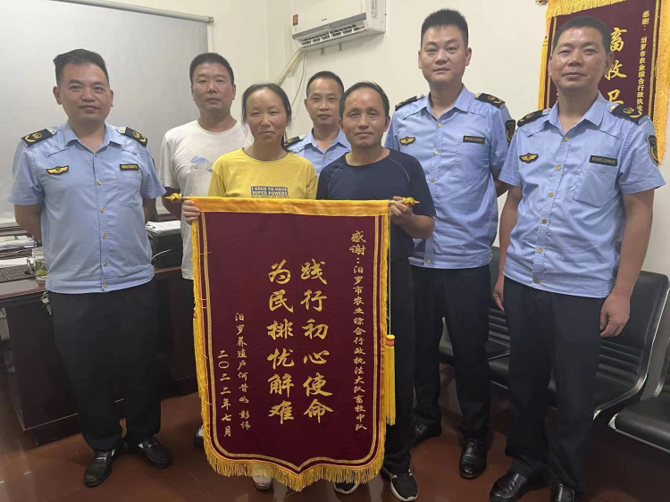 汨罗融媒体讯(通讯员 何家乐)“感谢党,感谢执法大队的队员,感谢你们!”,7月11日上午,汨罗市生猪养殖户何某激动地将一面写有“践行初心使命,为民排忧解难”的锦旗,送到汨罗市农业综合行政执法大队畜牧中队办公室,对执法人员跨区域调解仔猪买卖纠纷中的辛勤付出表示感谢。