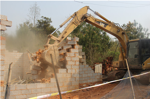 当天上午9时许,拆除行动正式开始。一辆大型挖掘机驶入现场,挥舞“铁臂”向一处房屋外墙砸去,伴随着巨大的轰鸣,该违章建筑轰然倒地。当天,执法组依法拆除了“飞地”园区启动区3平方公里范围内的汉山村青龙组、贺公组、塾塘组等6个组的10余处违章建筑。