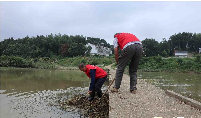 大荆镇”民间河长“于光辉和刘宏辉正在清理河道内的水草