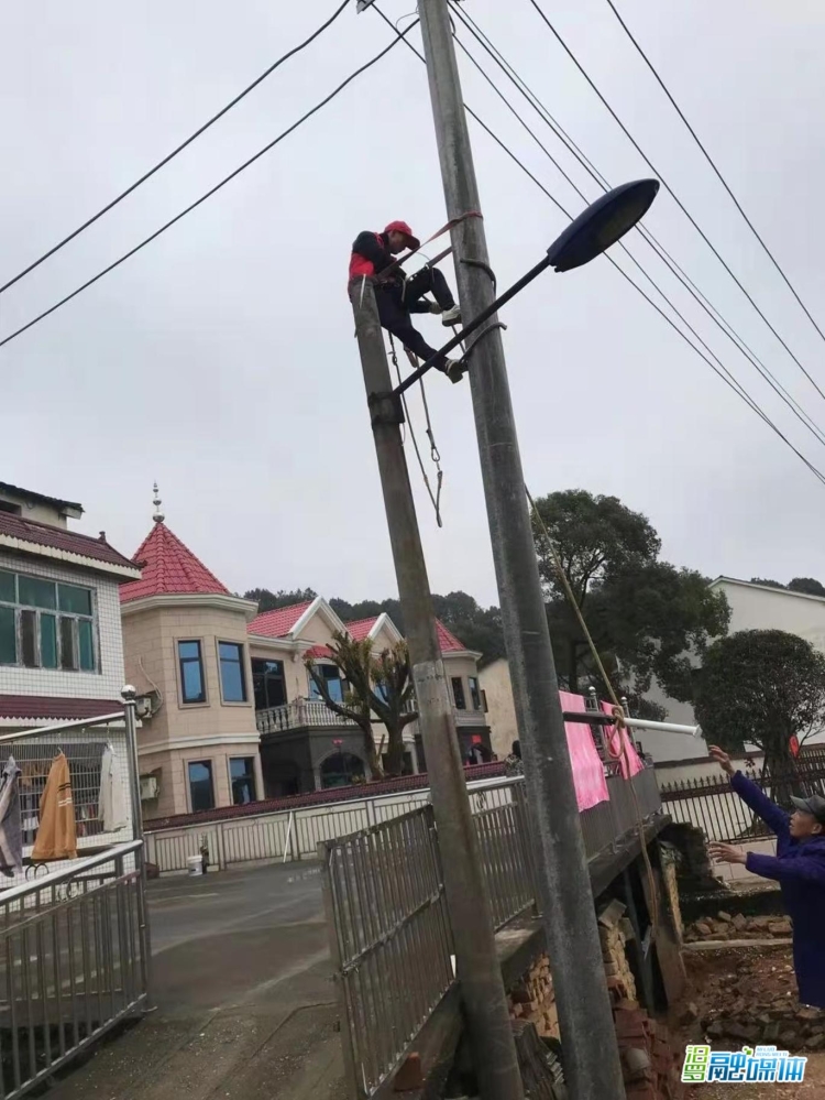 汨罗融媒体讯(通讯员 巢拓宇)"小心一点,可千万别摔着!"2月7日,在罗江镇滨江村,一群人盯着为安装路灯,爬上电线杆顶的曹朝辉。为了美化村级环境,让这个年更有年味,滨江村新时代文明实践站早早做了计划,志愿者捐资购买了十盏路灯,安装在村级主干道的显眼位置。