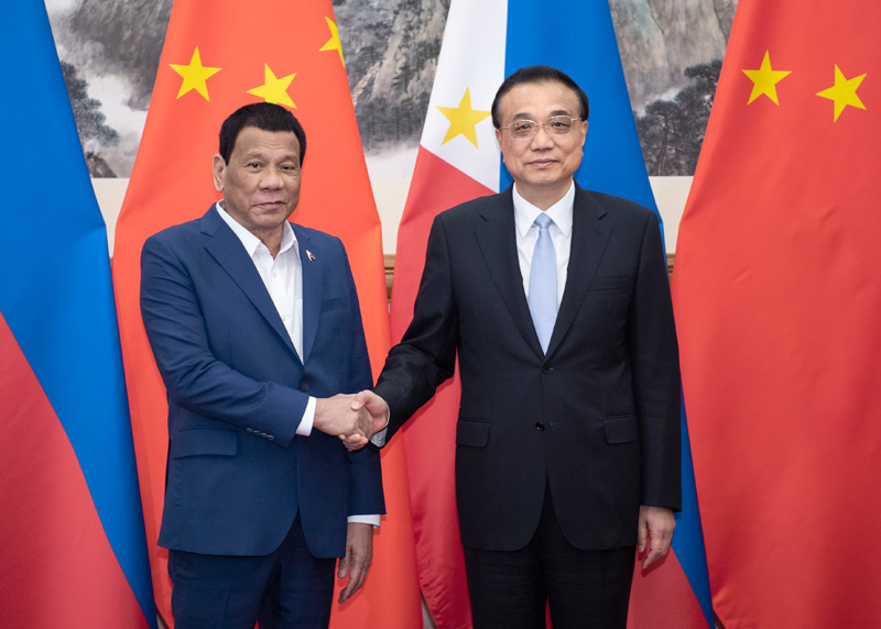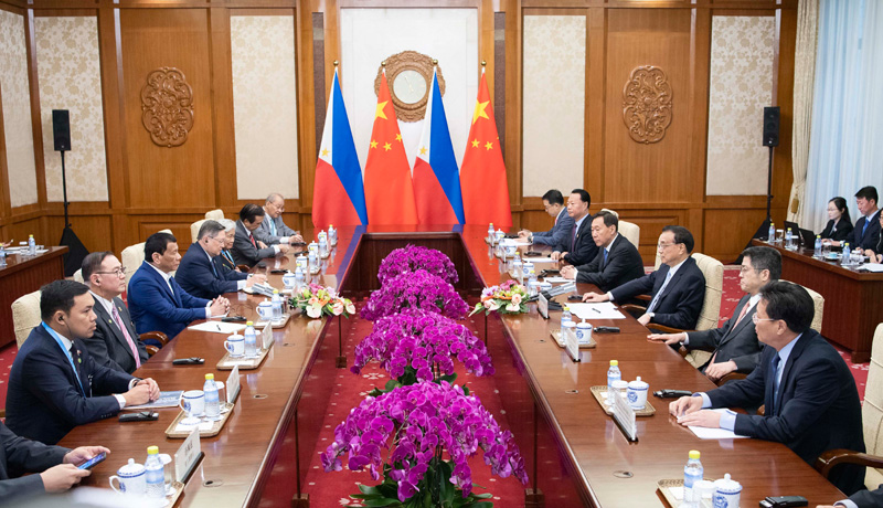 李克强表示,中菲是隔海相望的近邻,彼此的发展与稳定休戚相关。习近平主席同总统先生举行了富有成果的会见。总统先生就任三年来,经过双方共同努力,中菲关系实现转圜与巩固,沿着正确轨道持续向前发展。中方乐见菲经济社会发展取得新成就,愿将“一带一路”倡议同菲“大建特建”规划加强对接,深化经贸、投资往来,推进基础设施项目等合作。南海和平稳定符合中菲和地区各国共同利益。中方支持菲律宾履行中国-东盟关系协调国职责,期待尽快完成“南海行为准则”(COC)磋商。相信南海沿岸各国有能力、有智慧共同维护好南海和平稳定,坚持通过对话协商妥善处理存在的问题,携手实现共同发展。
