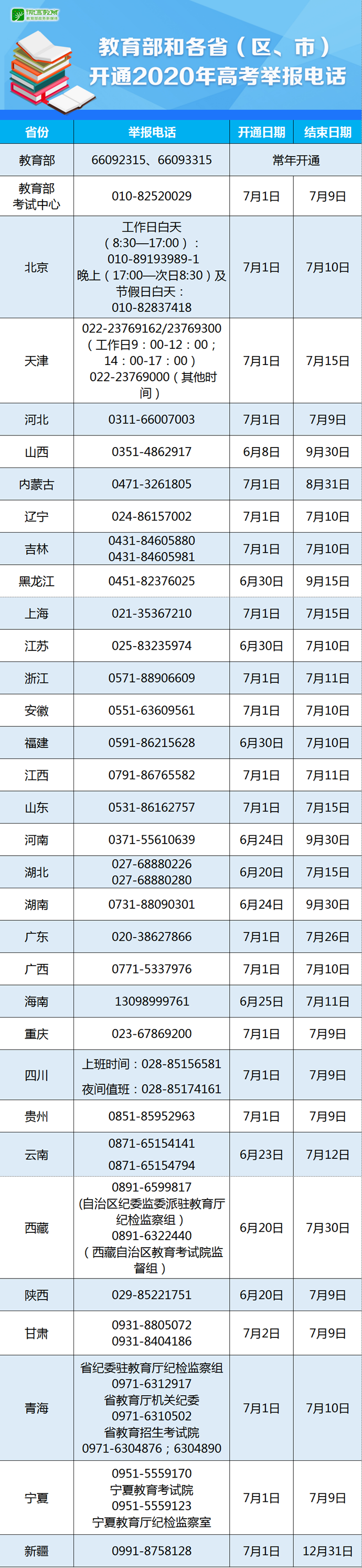 近日,教育部统一公布了教育部以及全国31个省(区、市)教育行政部门和招生考试机构2020年的高考举报电话,欢迎广大考生、家长及社会各界人士及时举报反映涉及2020年高考安全的线索。教育部及各省(区、市)将会同有关部门根据举报线索第一时间核查处理,坚决维护高考公平公正。