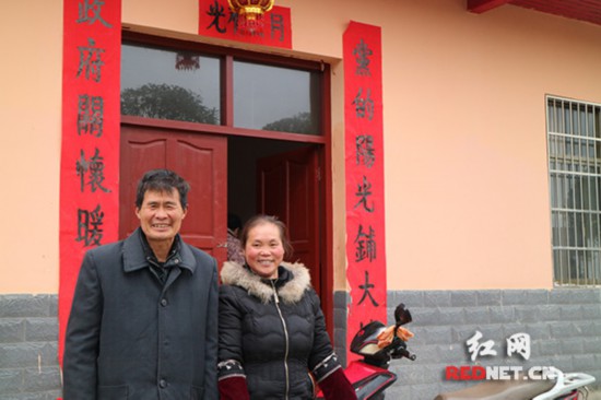 邵阳武冈市邓元泰镇凤溪村安置点周艳荣夫妇在新房子前开怀大笑。(资料图)
