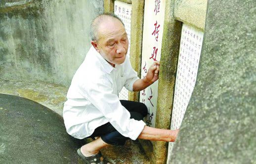7月11日,罗首章为罗哲烈士墓擦拭墓志铭。