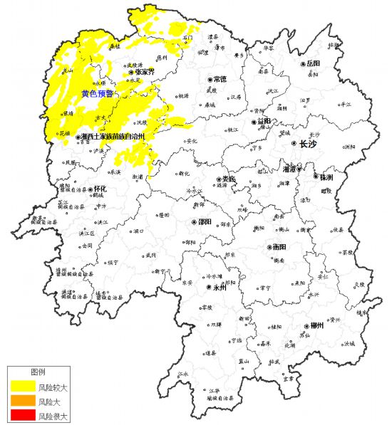 黄色预警区域为:常德市石门县西北部,张家界市永定区东南部、慈利县北部、桑植县,益阳市安化县西部,怀化市沅陵县、溆浦北部,湘西州泸溪县北部、花垣县、保靖县、古丈县、永顺县、龙山县等。