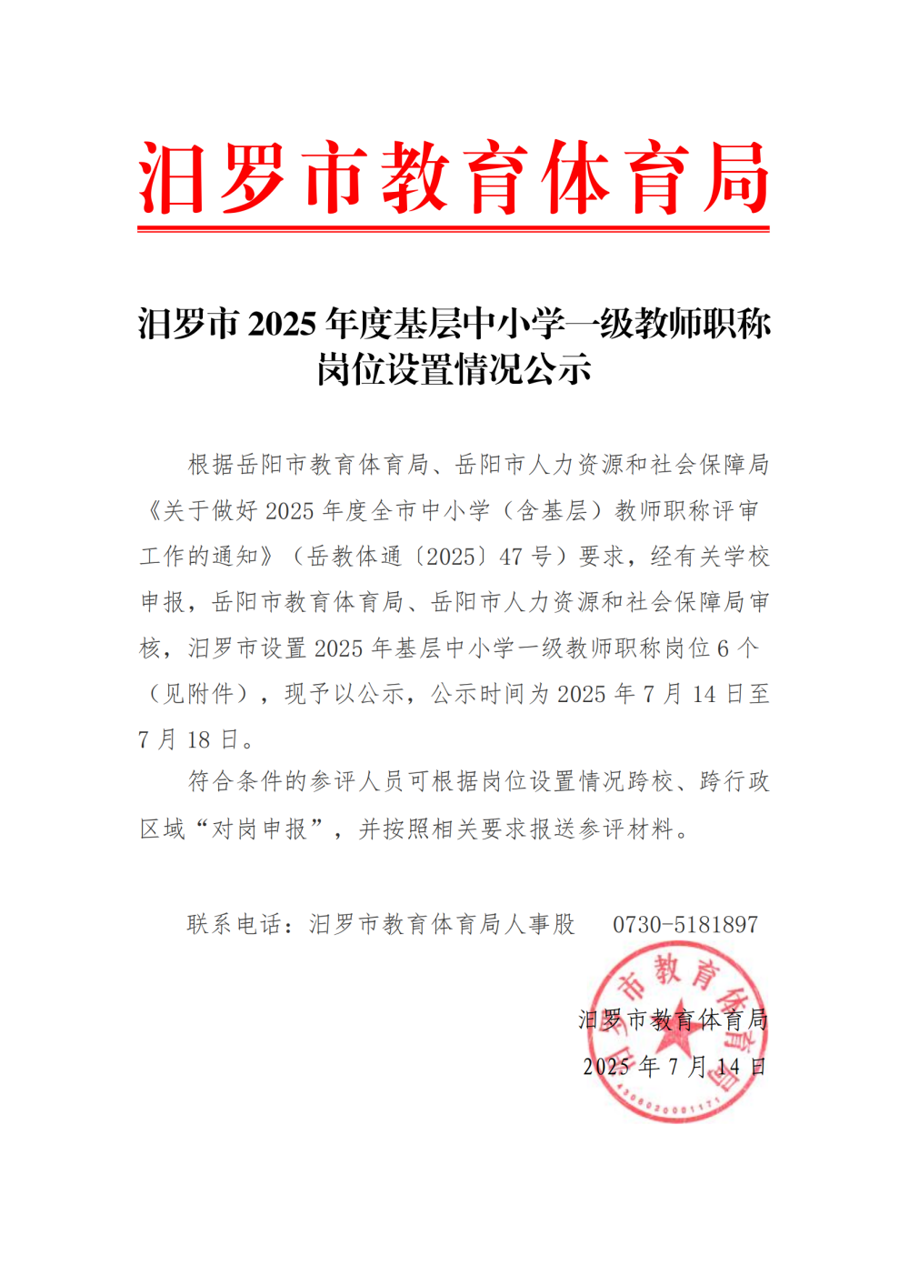 汨罗市2025年度基层中小学一级教师职称岗位设置情况公示