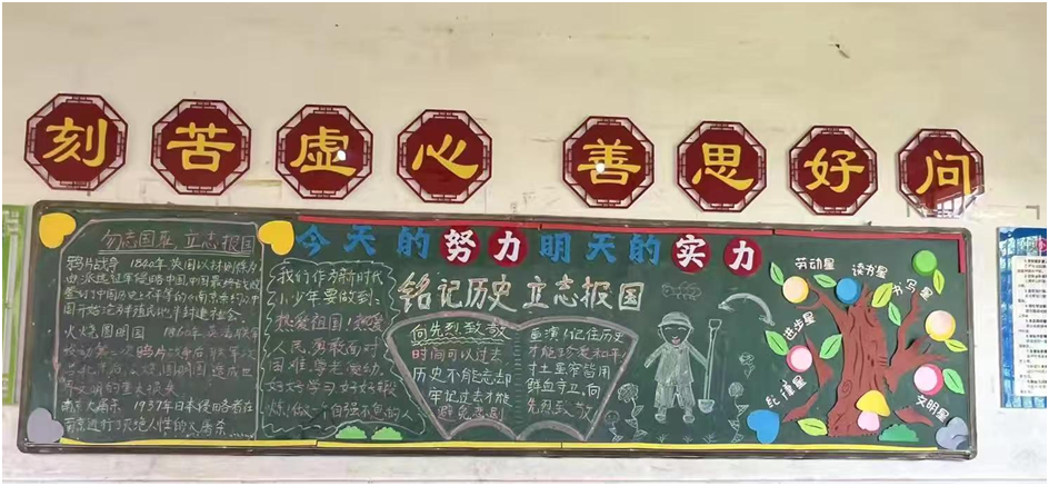 活动中,小学部的黑板报童趣与庄重并存,中学部的作品则更有深度。有的班级用画笔勾勒五星红旗、天安门等元素,搭配“少年强则国强”的手写标语;有的班级通过历史小故事插画、红色诗词摘抄,将“九一八事变”“南京大屠杀”等历史事件转化为易懂的图文;还有的班级匠心独具,让立体剪纸工艺完美融入图文,为板报效果锦上添花,引得师生驻足观赏,而大家热议的话题也是如何早日成为栋梁、报效祖国。