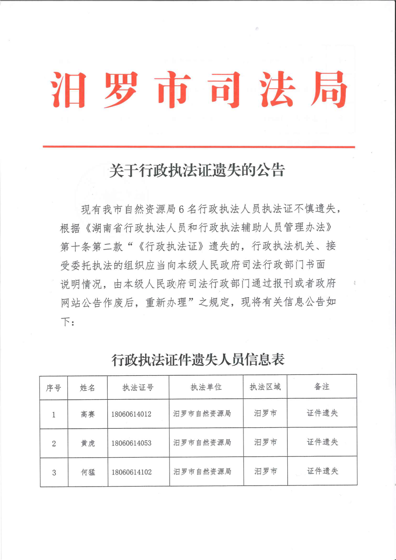 关于行政执法证遗失的公告