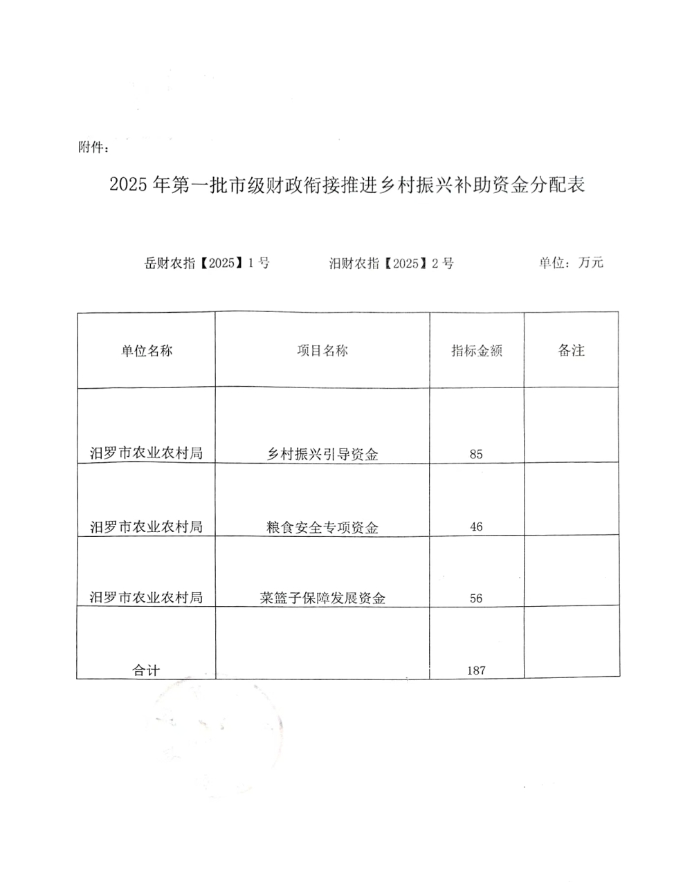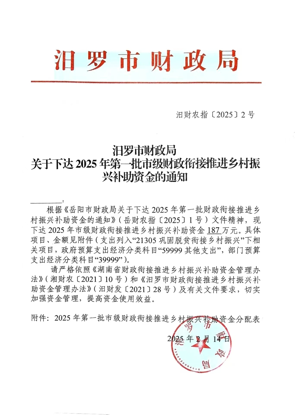 关于下达2025年第一批市级财政衔接推进乡村振兴补助资金的通知