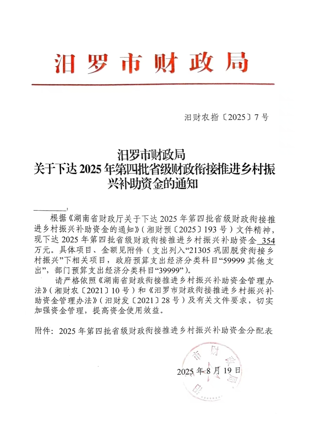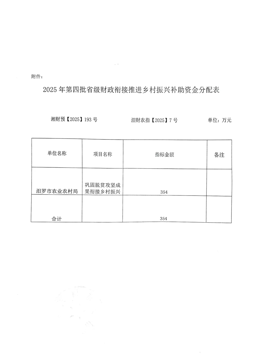 关于下达2025年第四批省级财政衔接推进乡村振兴补助资金的通知