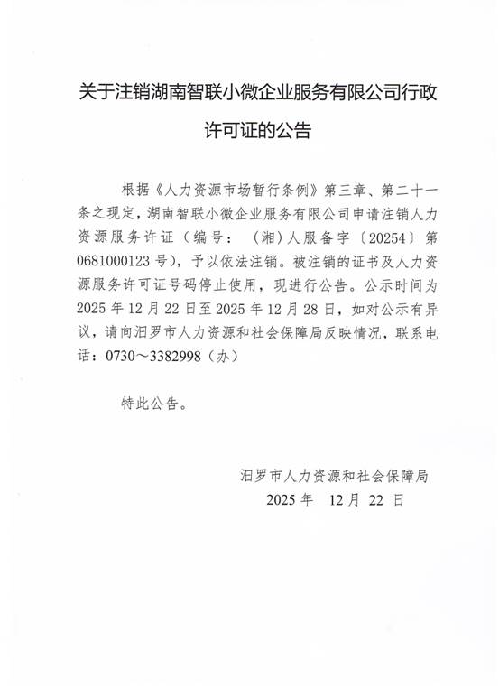 关于注销湖南智联小微企业服务有限公司行政许可证的公告