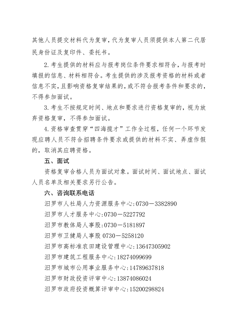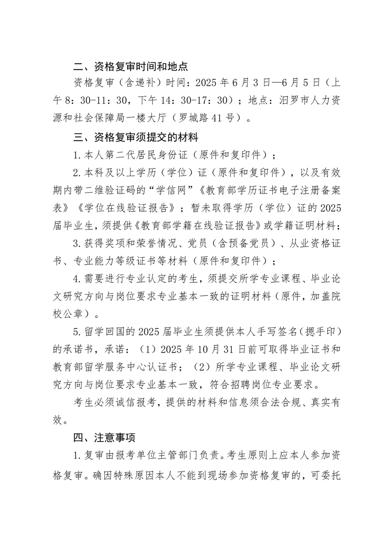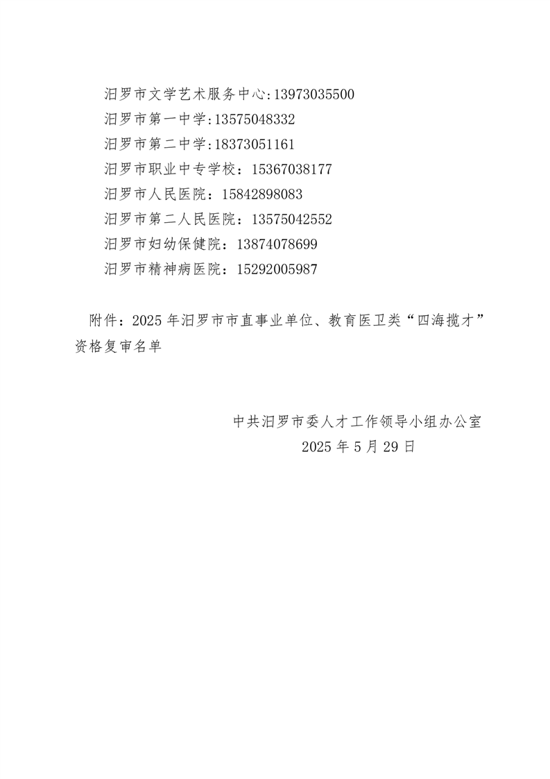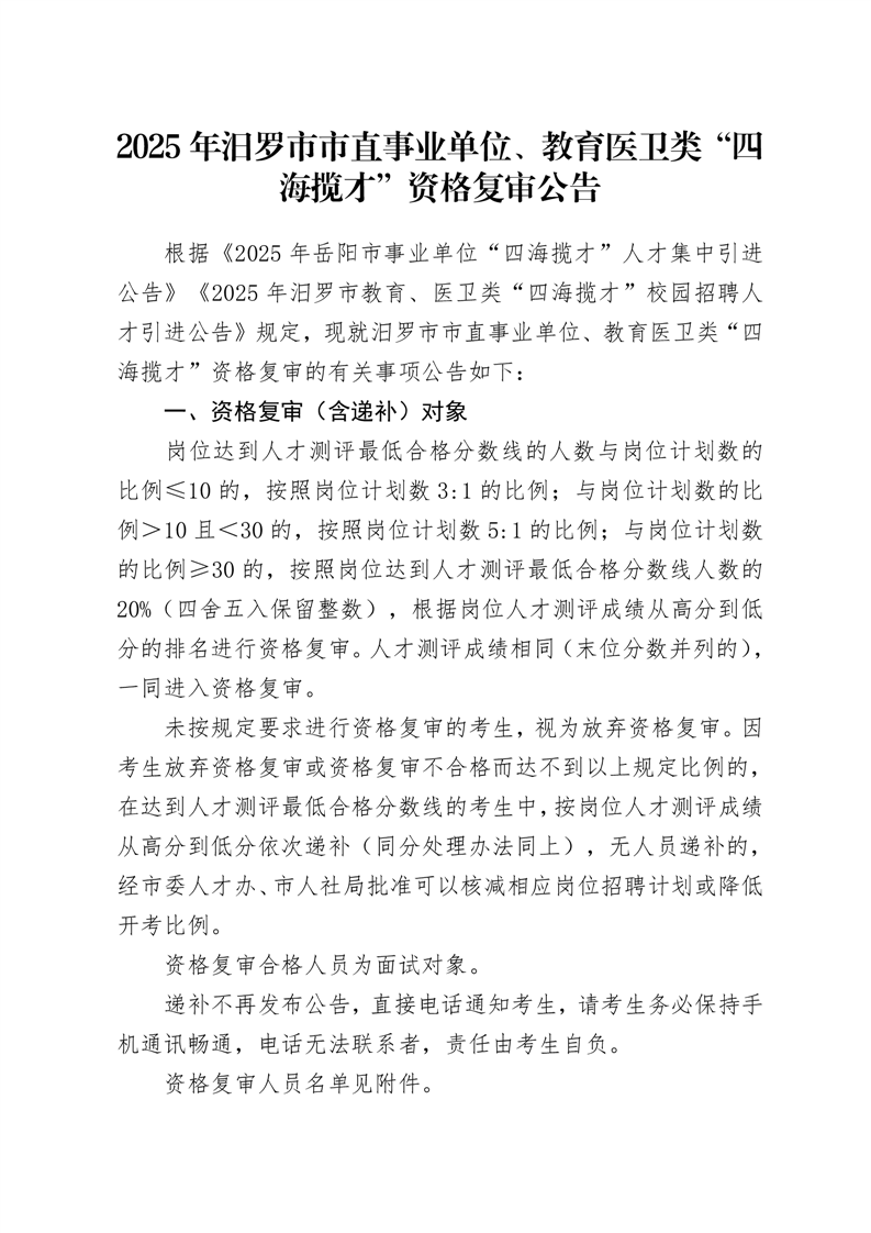 2025年汨罗市市直事业单位、教育医卫类“四海揽才”资格复审公告