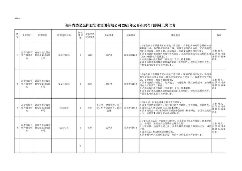 附件1 湖南省楚之晟控股实业集团有限公司2025年度公开招聘合同制员工岗位表.xlsx