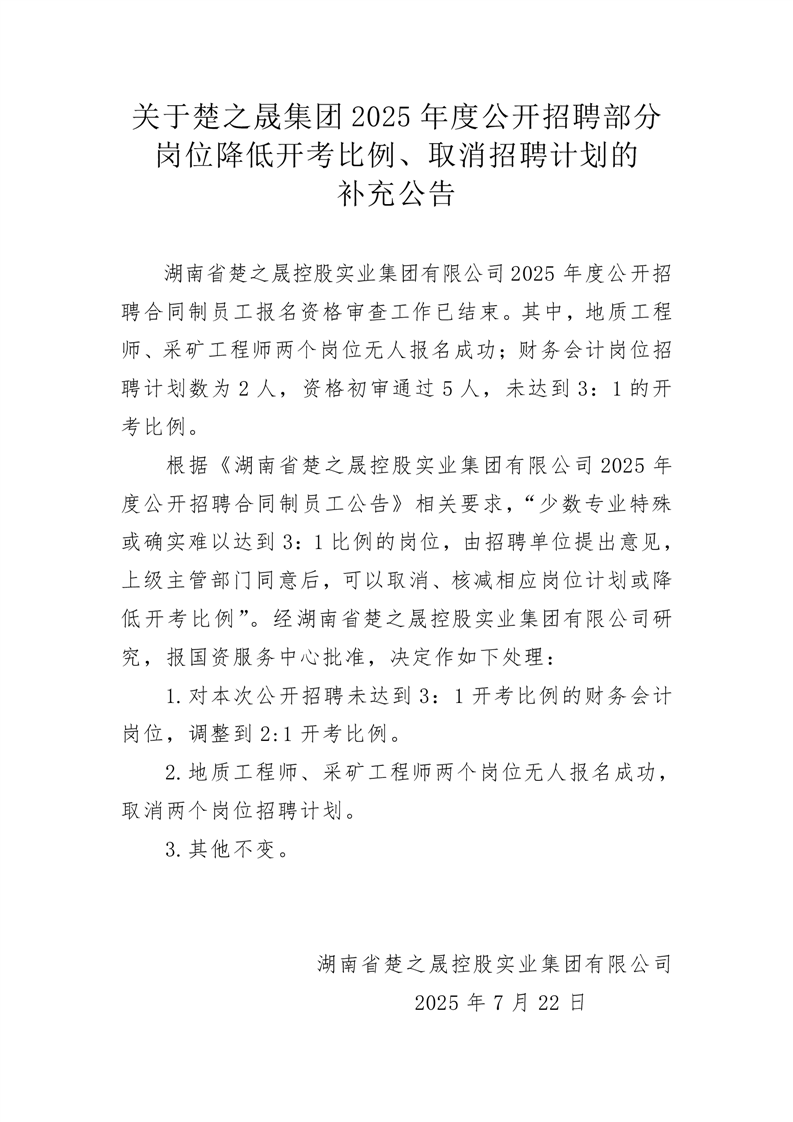 关于楚之晟集团2025年度公开招聘部分岗位降低开考比例、取消招聘计划的补充公告