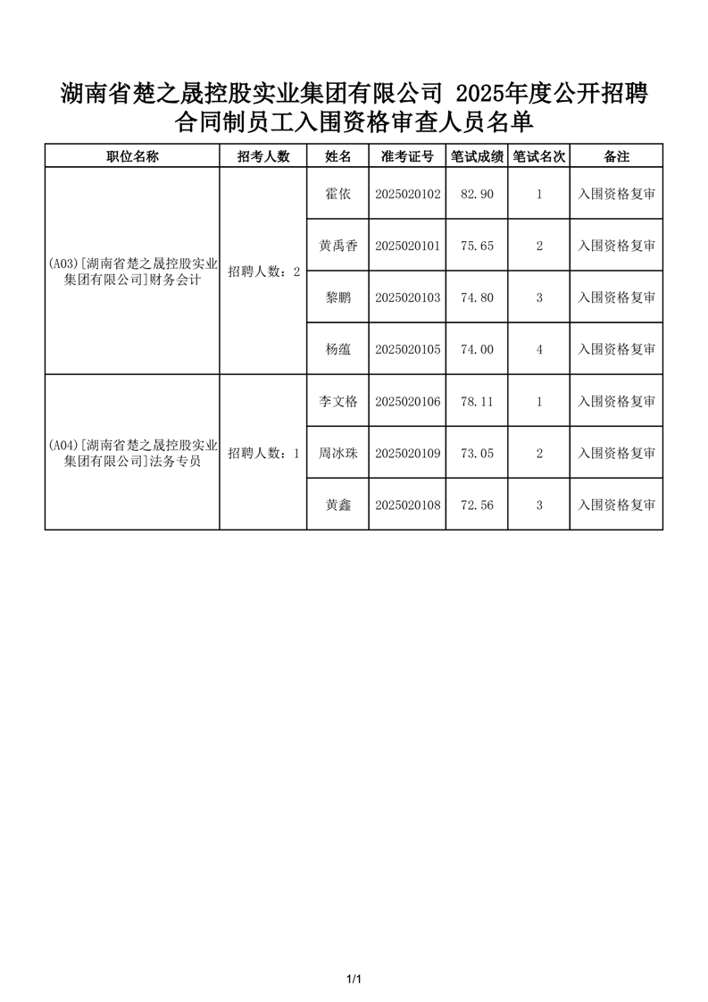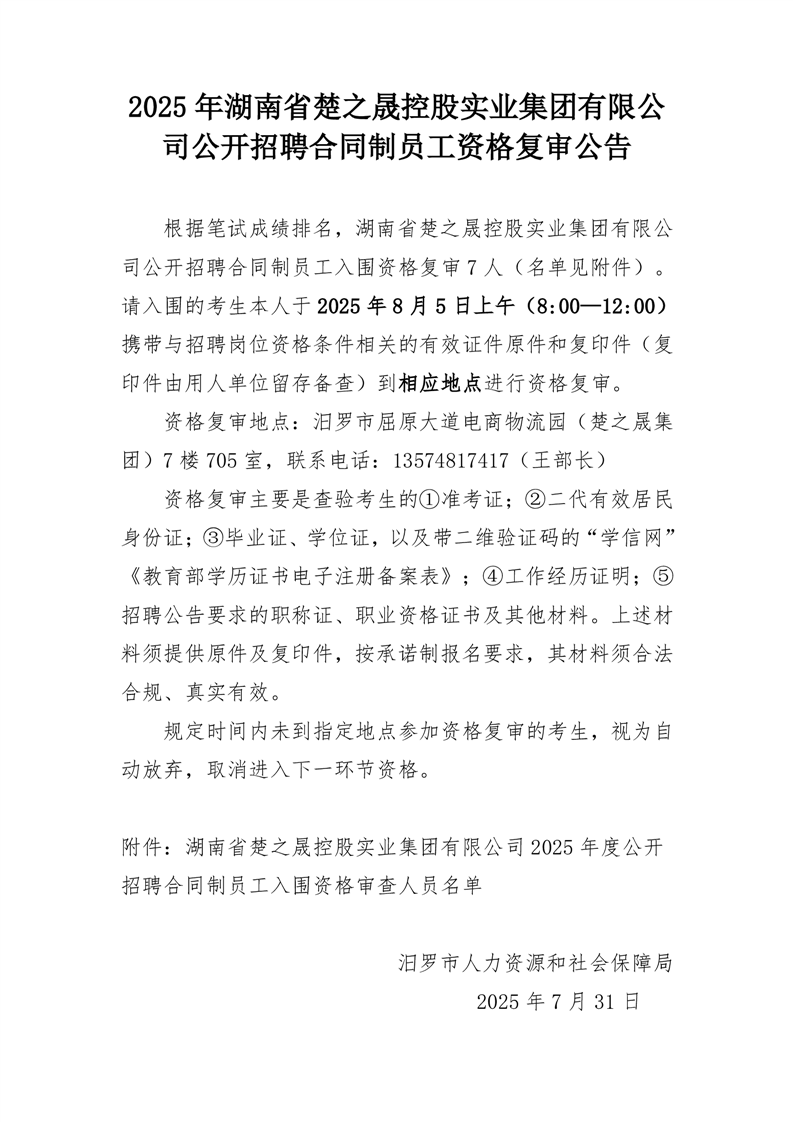 2025 年湖南省楚之晟控股实业集团有限公司公开招聘合同制员工资格复审公告