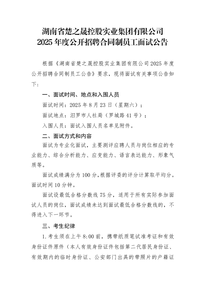 湖南省楚之晟控股实业集团有限公司2025年度公开招聘合同制员工面试公告