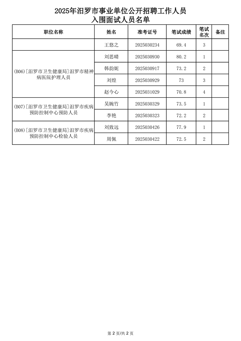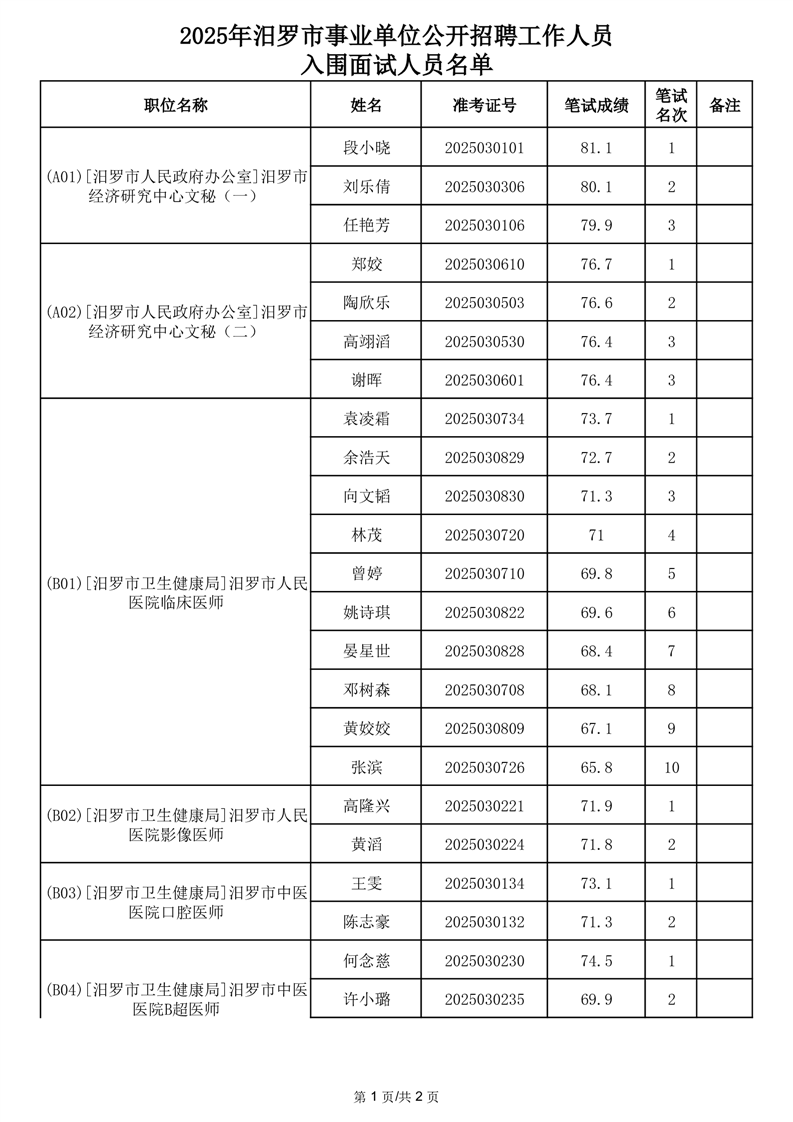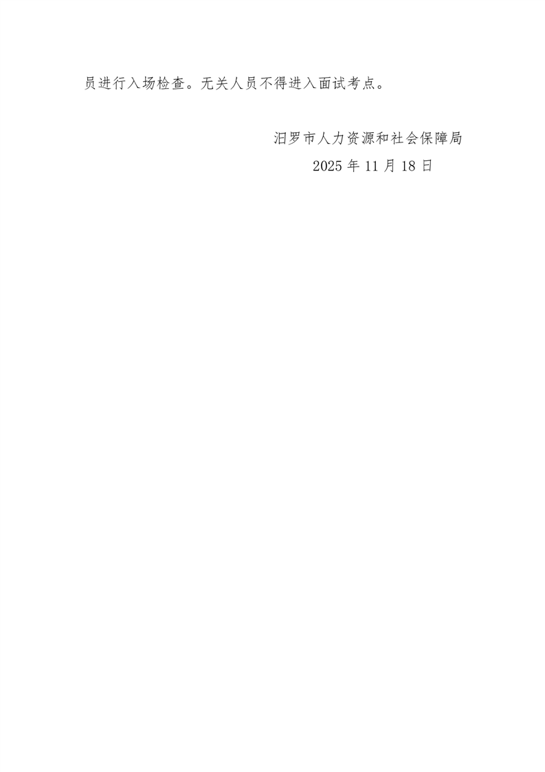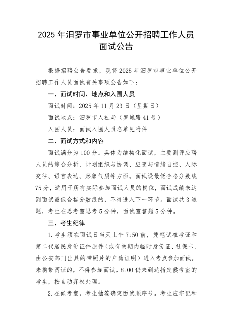 2025年汨罗市事业单位公开招聘工作人员面试公告