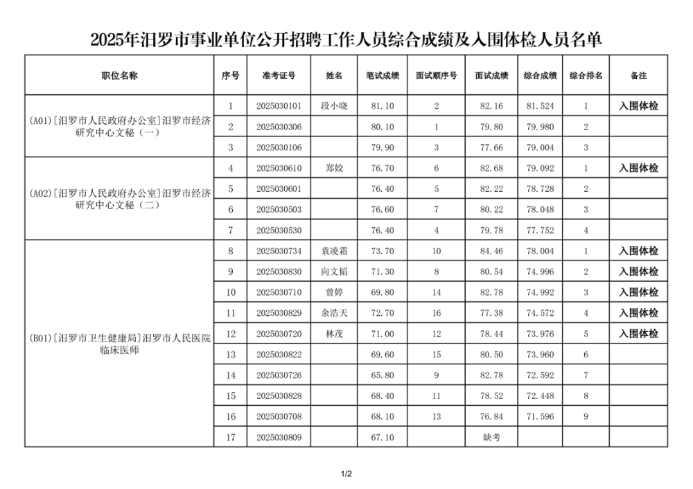 2025年汨罗市事业单位公开招聘工作人员综合成绩及入围体检人员名单公示