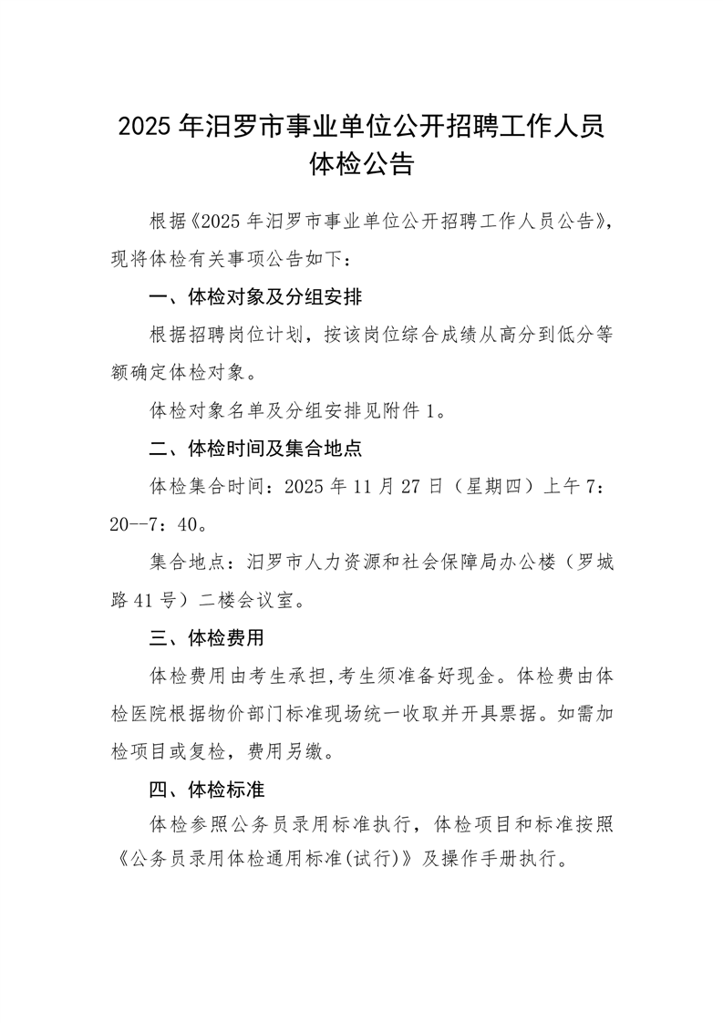 2025年汨罗市事业单位公开招聘工作人员体检公告