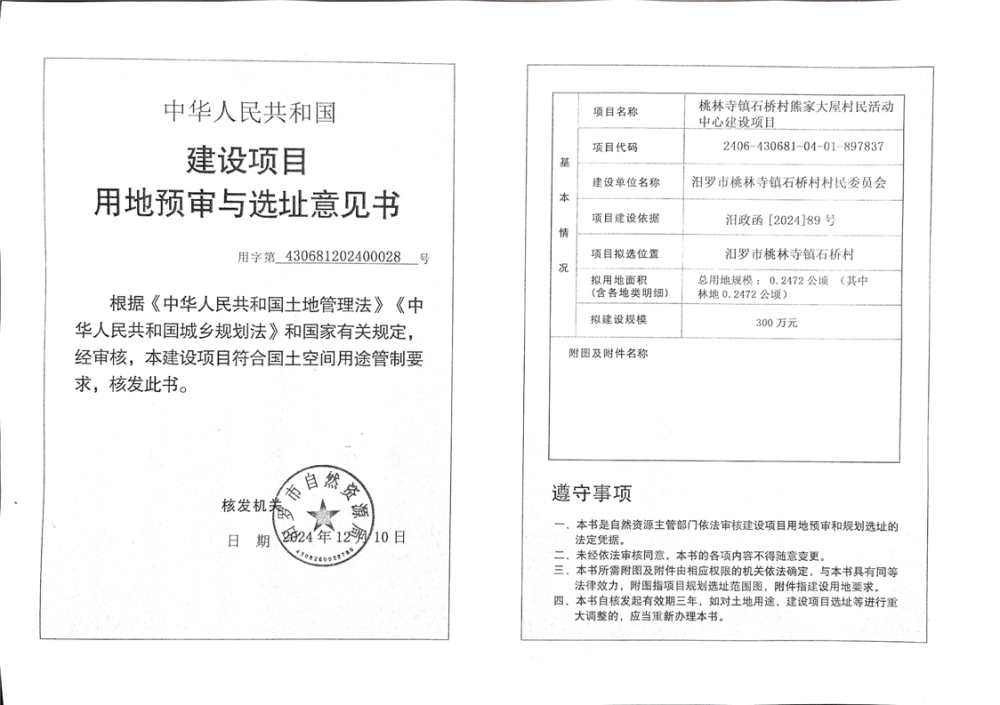 桃林寺镇石桥村熊家大屋村民活动中心建设项目用地预审与选址意见书