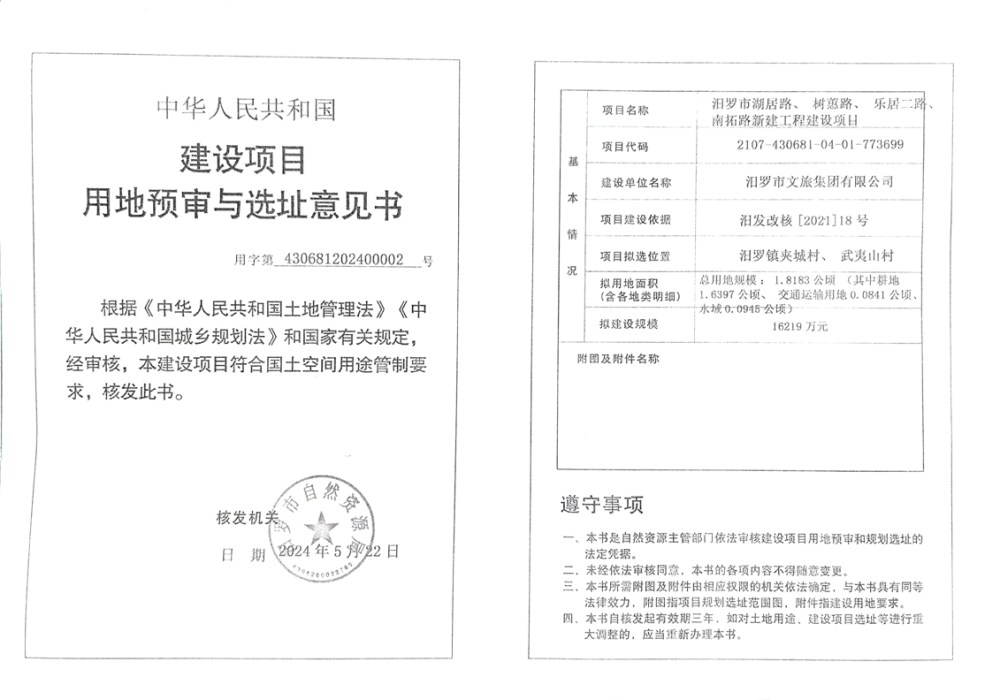 汨罗市湖居路、树蕙路、乐居二路、南拓路新建工程建设项目用地预审与选址意见书