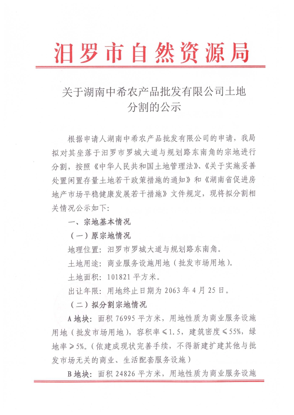 关于湖南中希农产品批发有限公司土地分割的公示