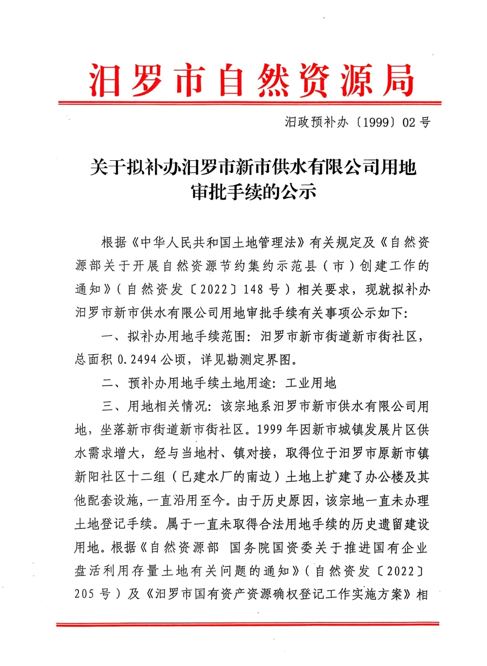 关于拟补办汨罗市新市供水有限公司用地审批手续的公示