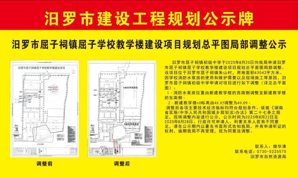 汨罗市屈子祠镇屈子学校教学楼建设项目规划总平图局部调整公示