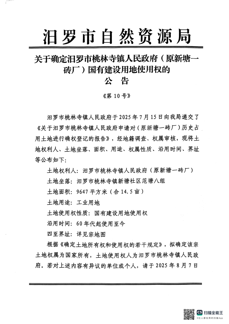 关于确认汨罗市桃林寺镇人民政府(原新塘一砖厂)国有建设用地使用权的公告