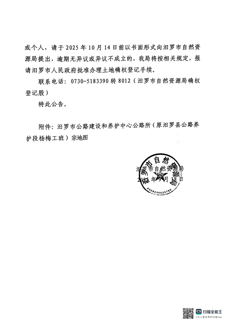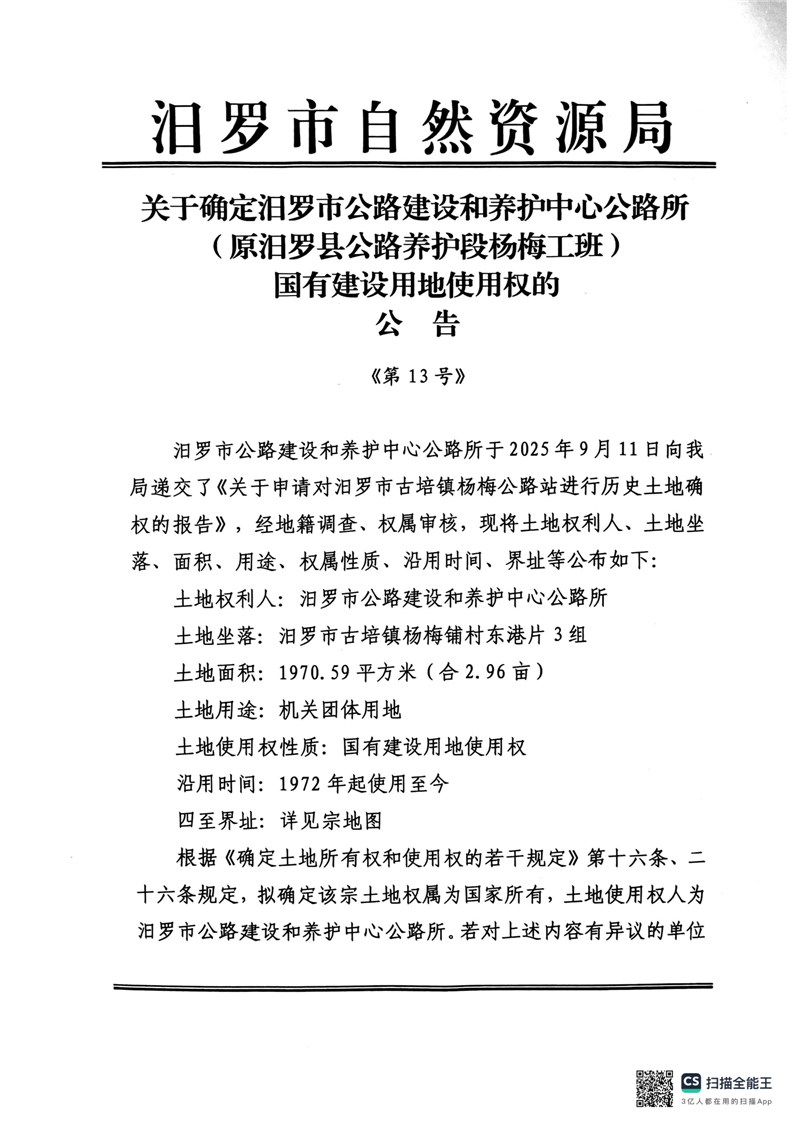 关于确定汨罗市公路建设和养护中心公路所(原汨罗县公路养护段杨梅工班)国有建设用地使用权的公告